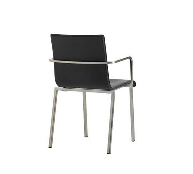 Stackable* armchair. Seat and back upholstered with genuine or regenerated leather with visible stitches, chromed, satinized or powder coated square steel tub frame.