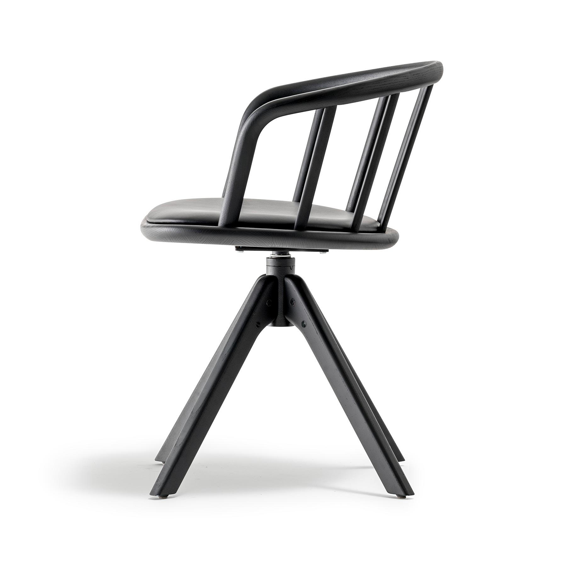 Armchair. Ash wood backrest, structure and legs. Upholstered seat. Swivel base with automatic return device.