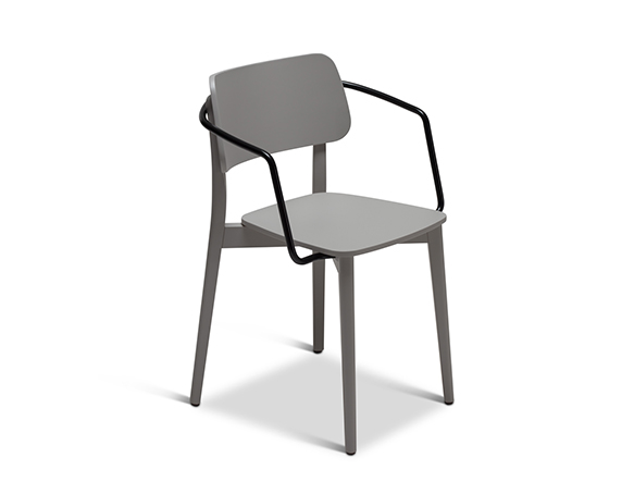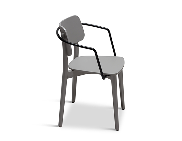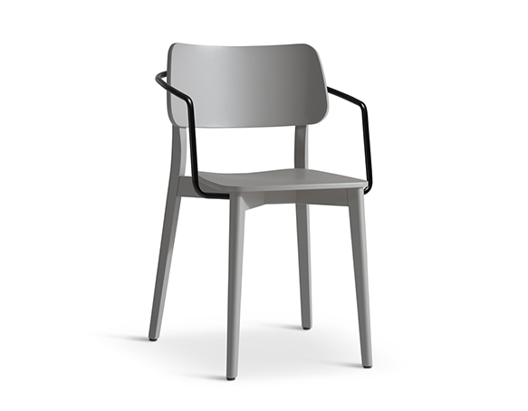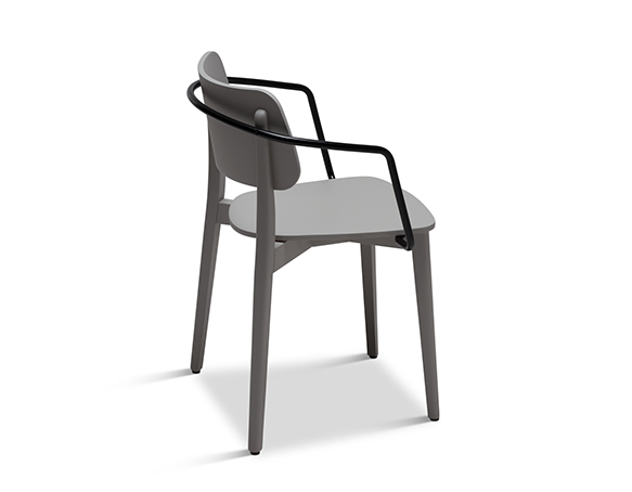 Stackable armchair. Wood structure, metal arms. Available in wood stain and lacquer finishes.