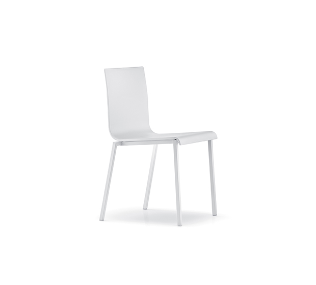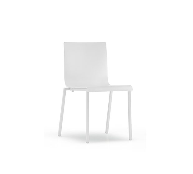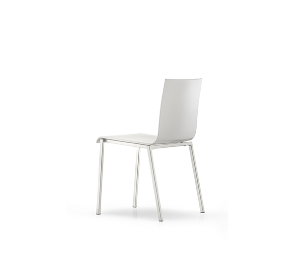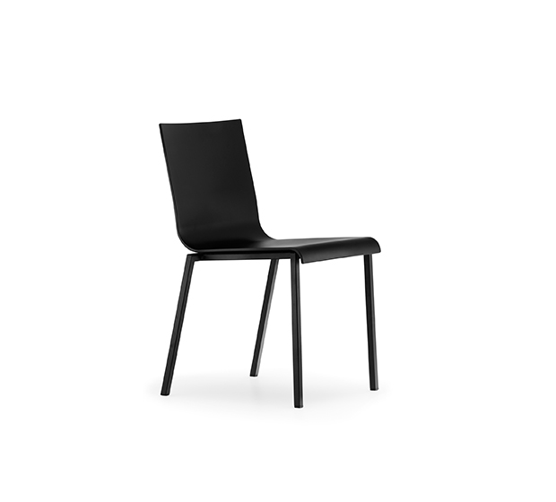 Stackable side chair. Technopolymer seat and back, chromed, satinized or powder coated square steel tub frame.