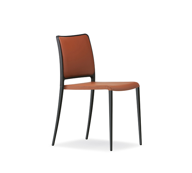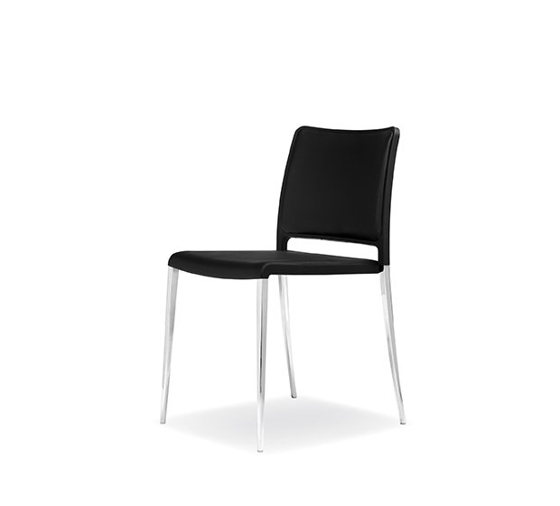 Stackable* side chair. Upholstered seat and back, polished, brushed or powder coated aluminum tub frame.