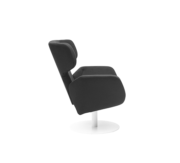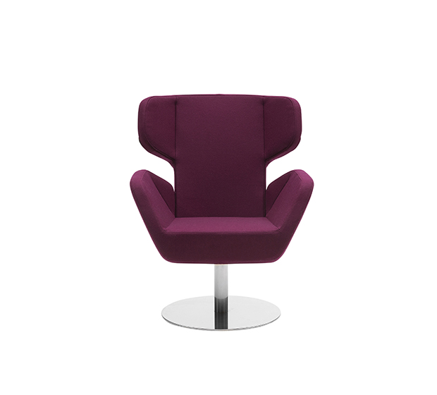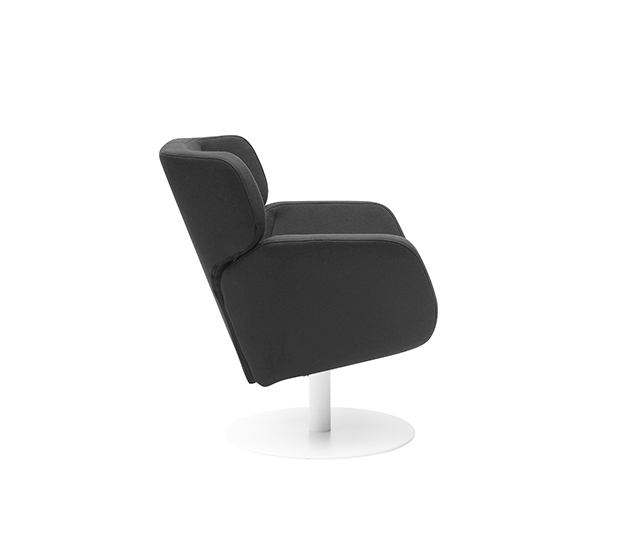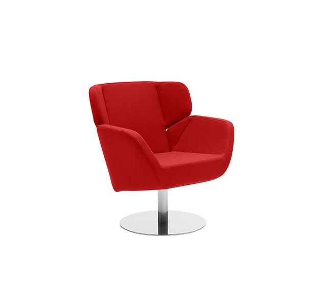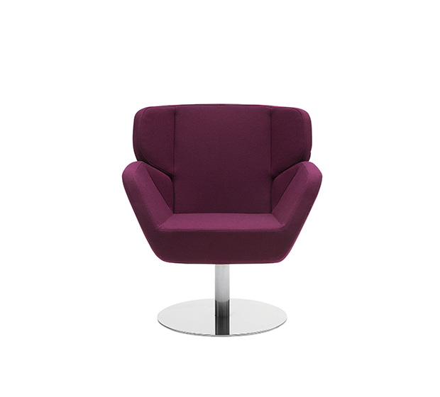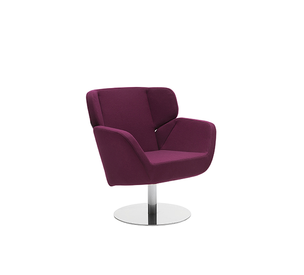Lounge armchair with central base. Upholstered seat and back, chromed or lacquered steel frame.