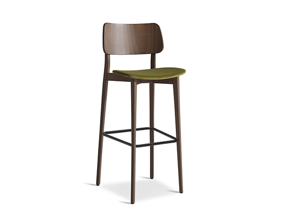 Solid wood bar stool. Upholstered seat. Available in wood stain finish or lacquered finish.