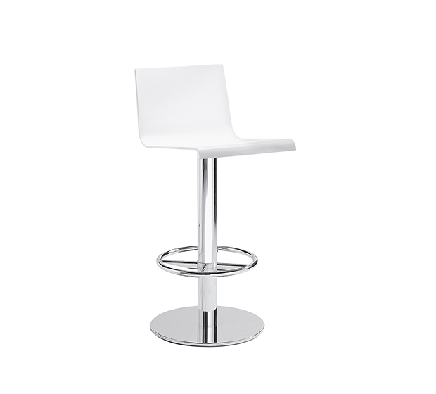 Swiveling bar height stool with central base. Technopolymer seat and back, chromed, brushed or powder coated steel frame.