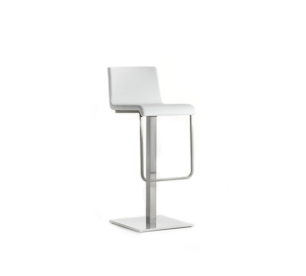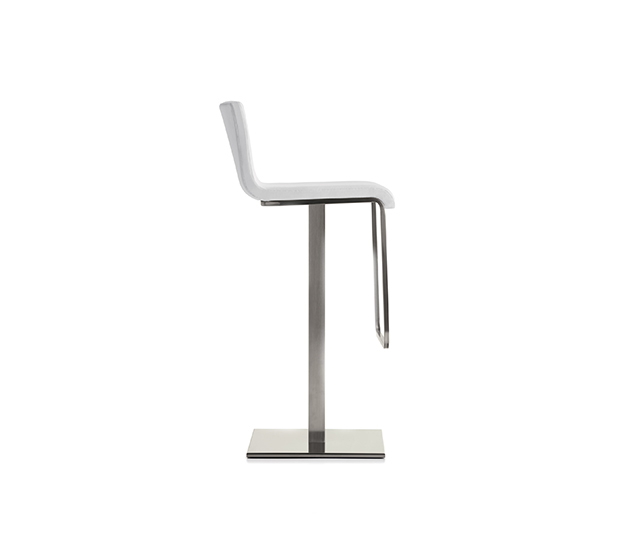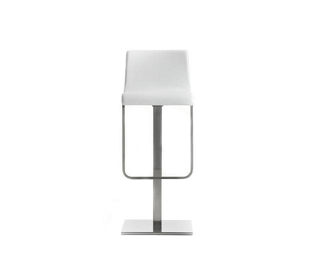 Swiveling bar height stool with central base. Upholstered seat and back, satinized steel frame.