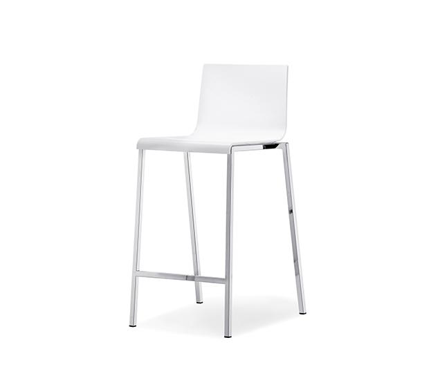 Stackable counter height stool. Technopolymer seat and back, chromed, satinized or silver powder coated square steel tub frame.