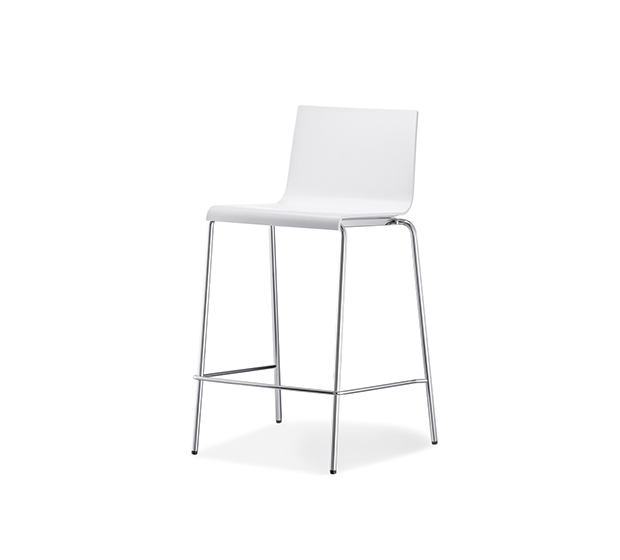Stackable counter height stool. Technopolymer seat and back, chromed, satinized or silver powder coated round steel tub frame.