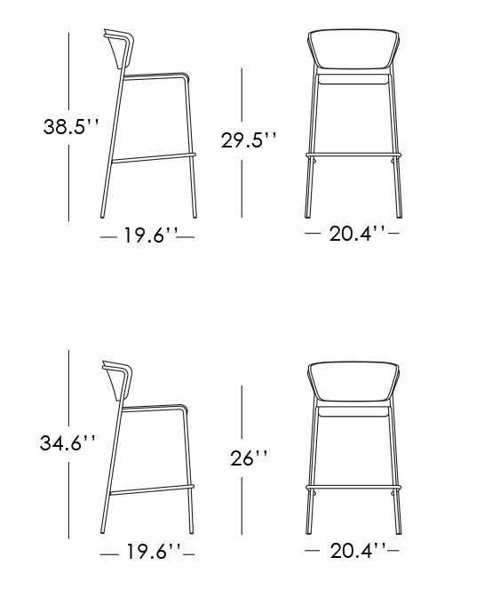 Stackable stool. Seat and backrest made of technopolymer, metal frame. Two heights available. Suitable for outdoor use.