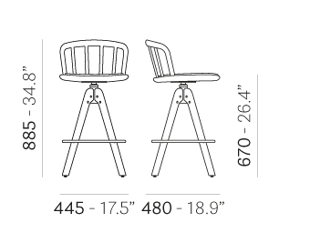 Counter-height swivel stool. Arched bentwood backrest, upholstered solid wood seat. Trestle-style base in solid ash wood. Steel footrest.