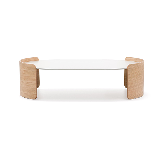 Side table. Solid laminate oval top, oak plywood side panels. Low height.