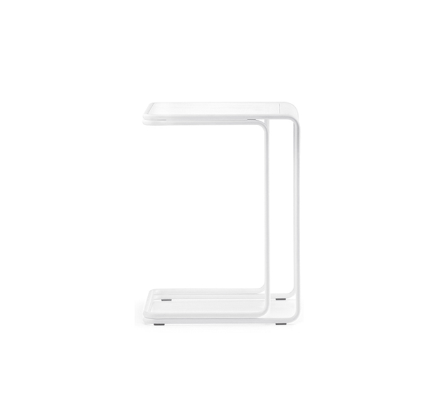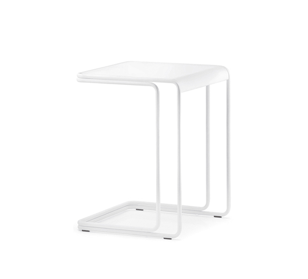 Side table with cantilever frame. Methacrylate top with round corners, powder coated square steel tub frame.