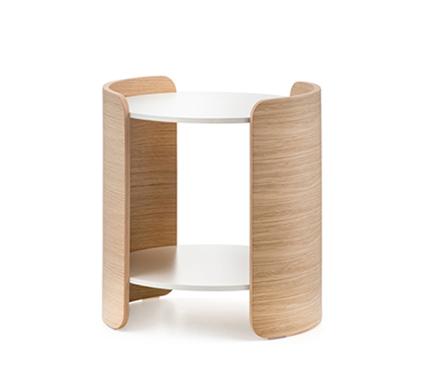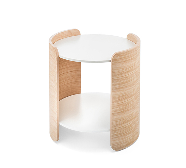 Side table. 2 solid laminate round tops, oak plywood side panels. Low height.