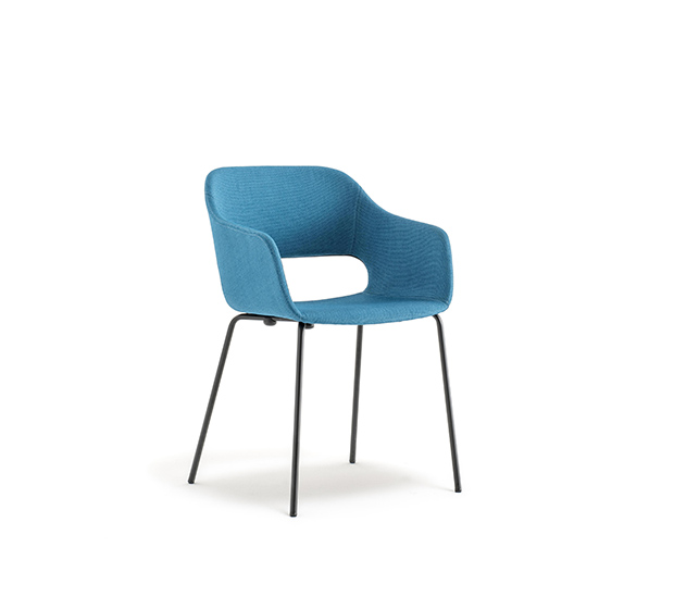 Chaise avec bras. Assise et dossier rembourrés, structure tubulaire ronde en acier chromé ou peint.
