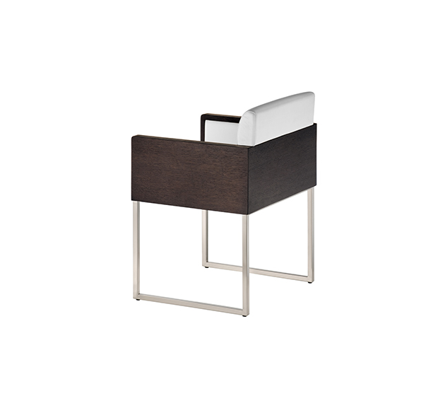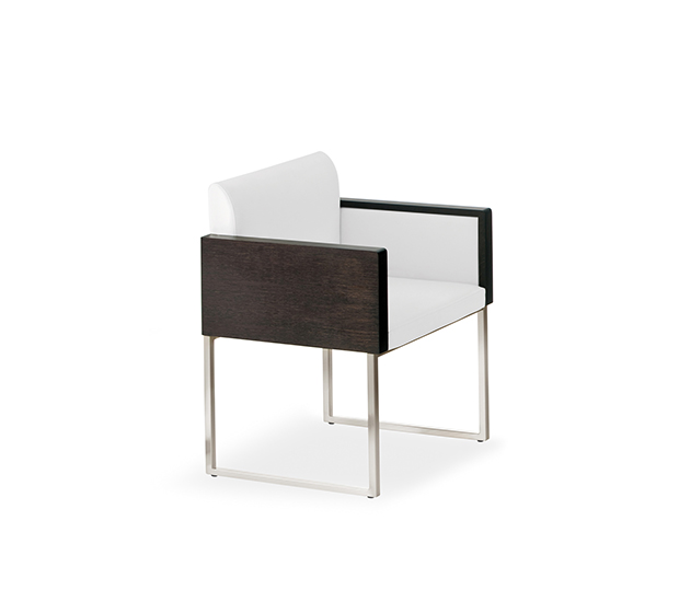 Fauteuil avec bras à base traîneau. Assise et dossier rembourrés, partie extérieure des bras finis en bois, structure tubulaire carrée en acier satiné.