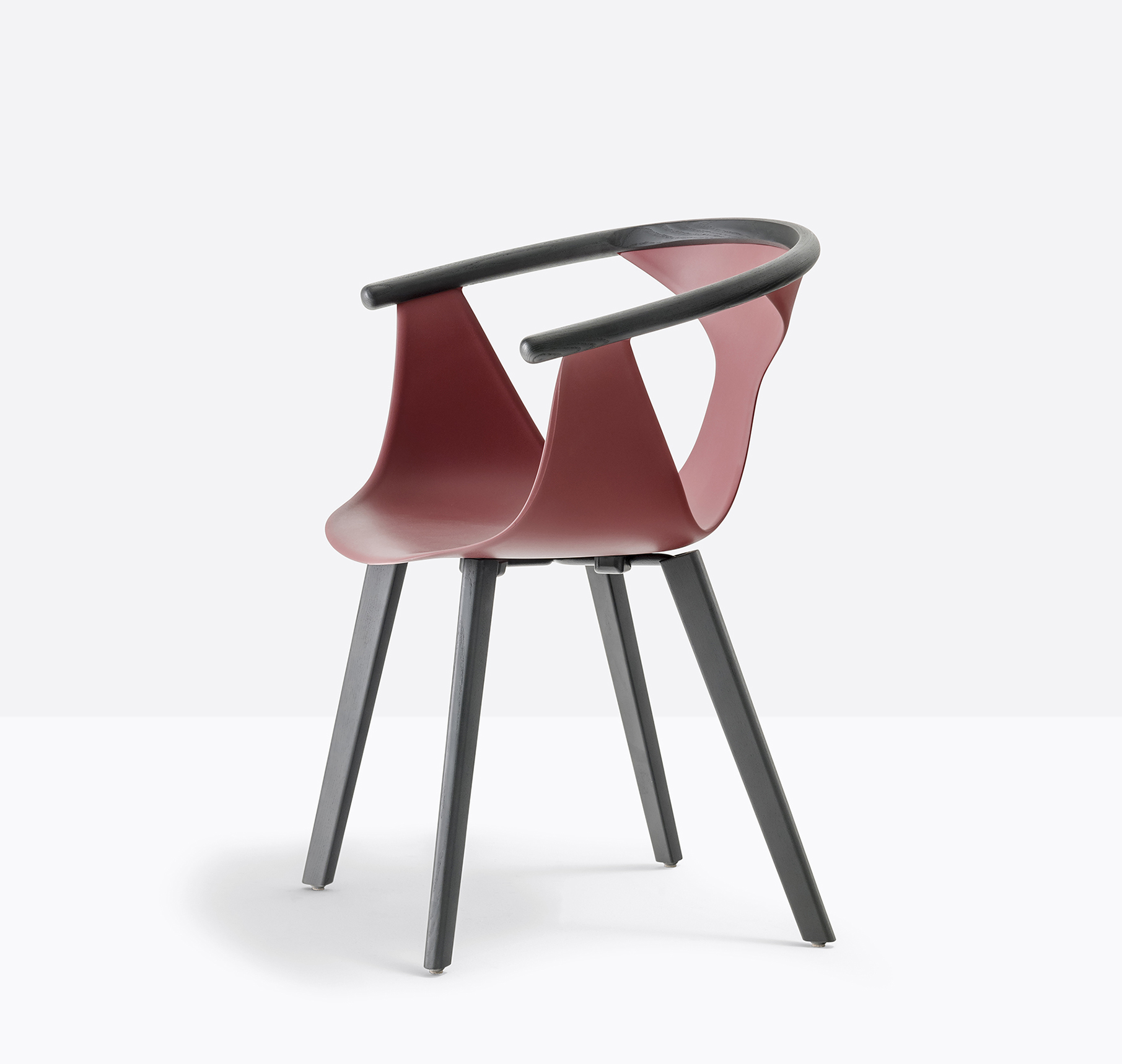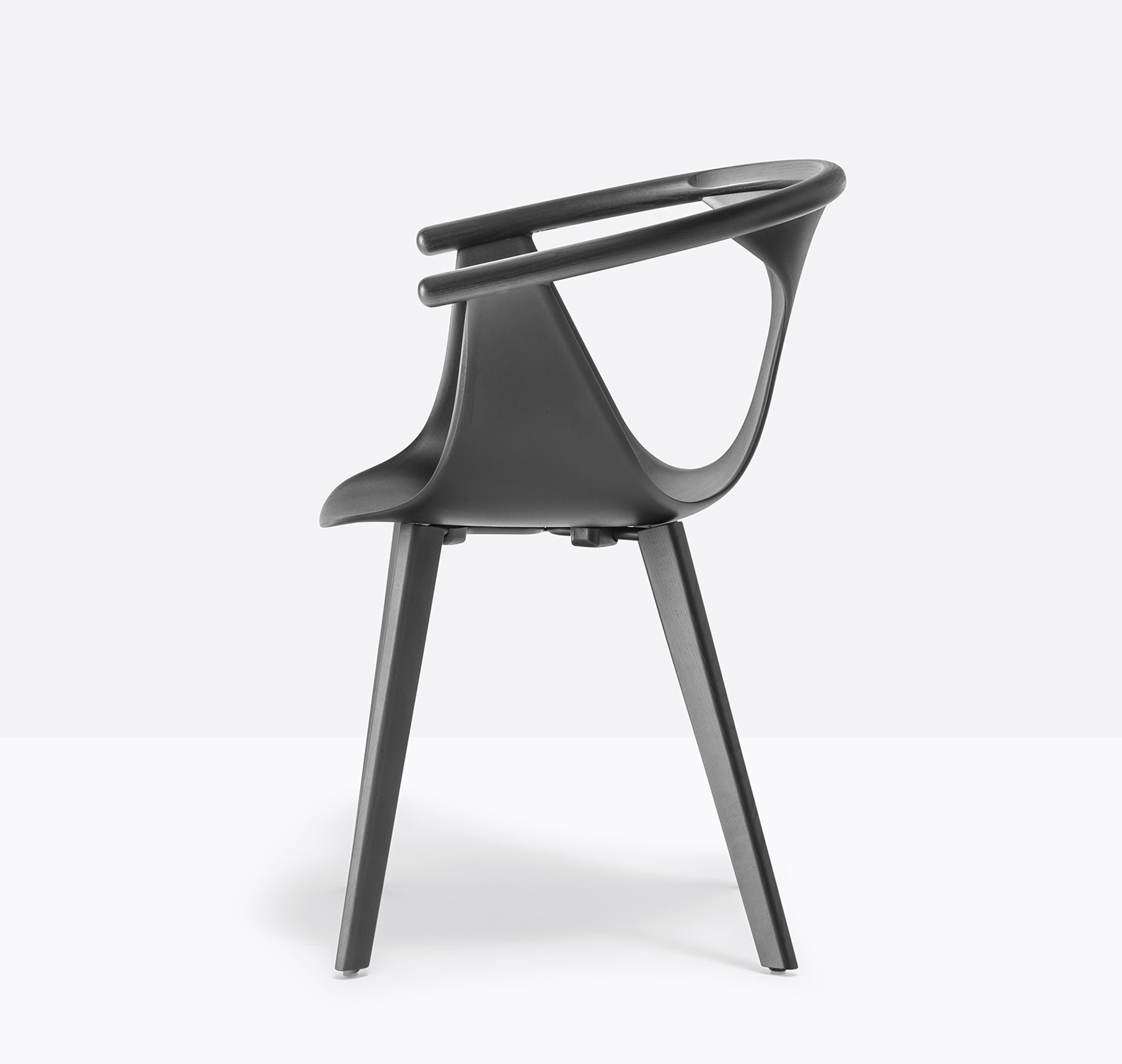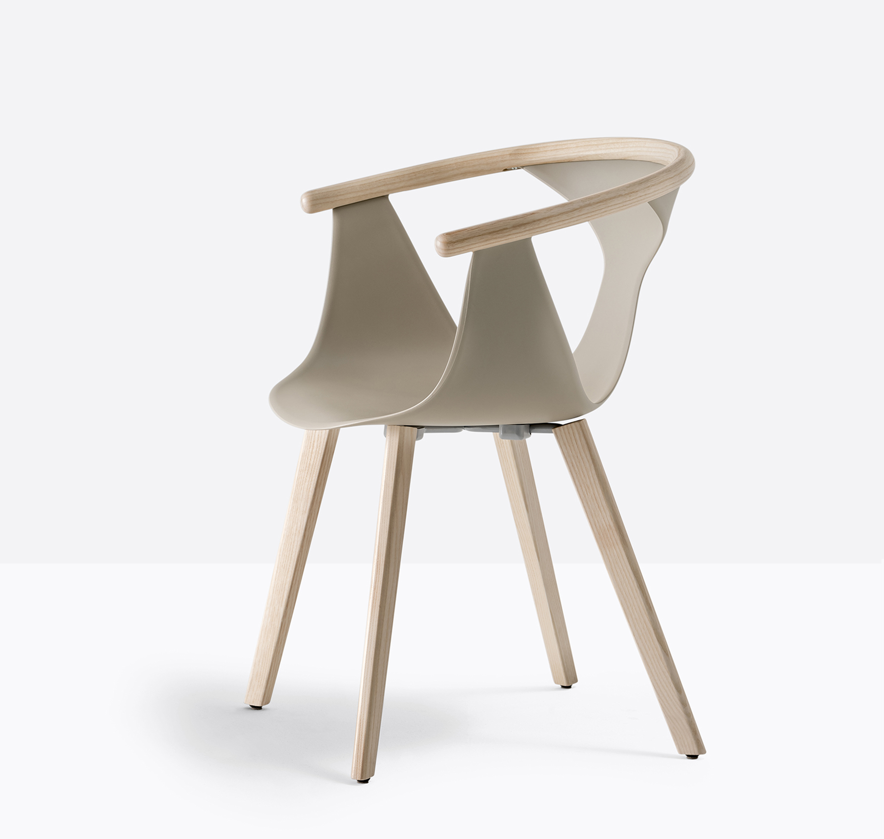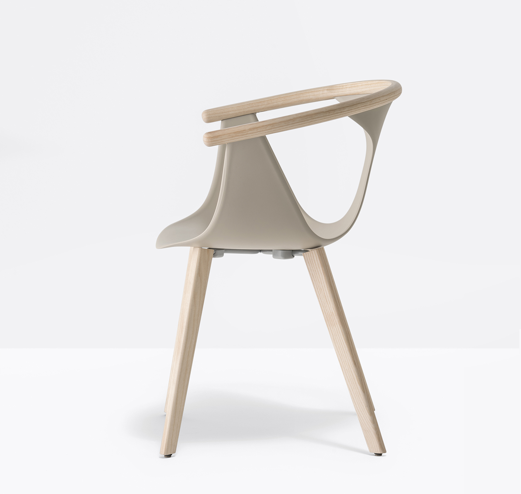 Chaise avec bras. Coque en polypropylène renforcée de fibre de verre. Contour de dossier en frêne. Pattes en frêne.