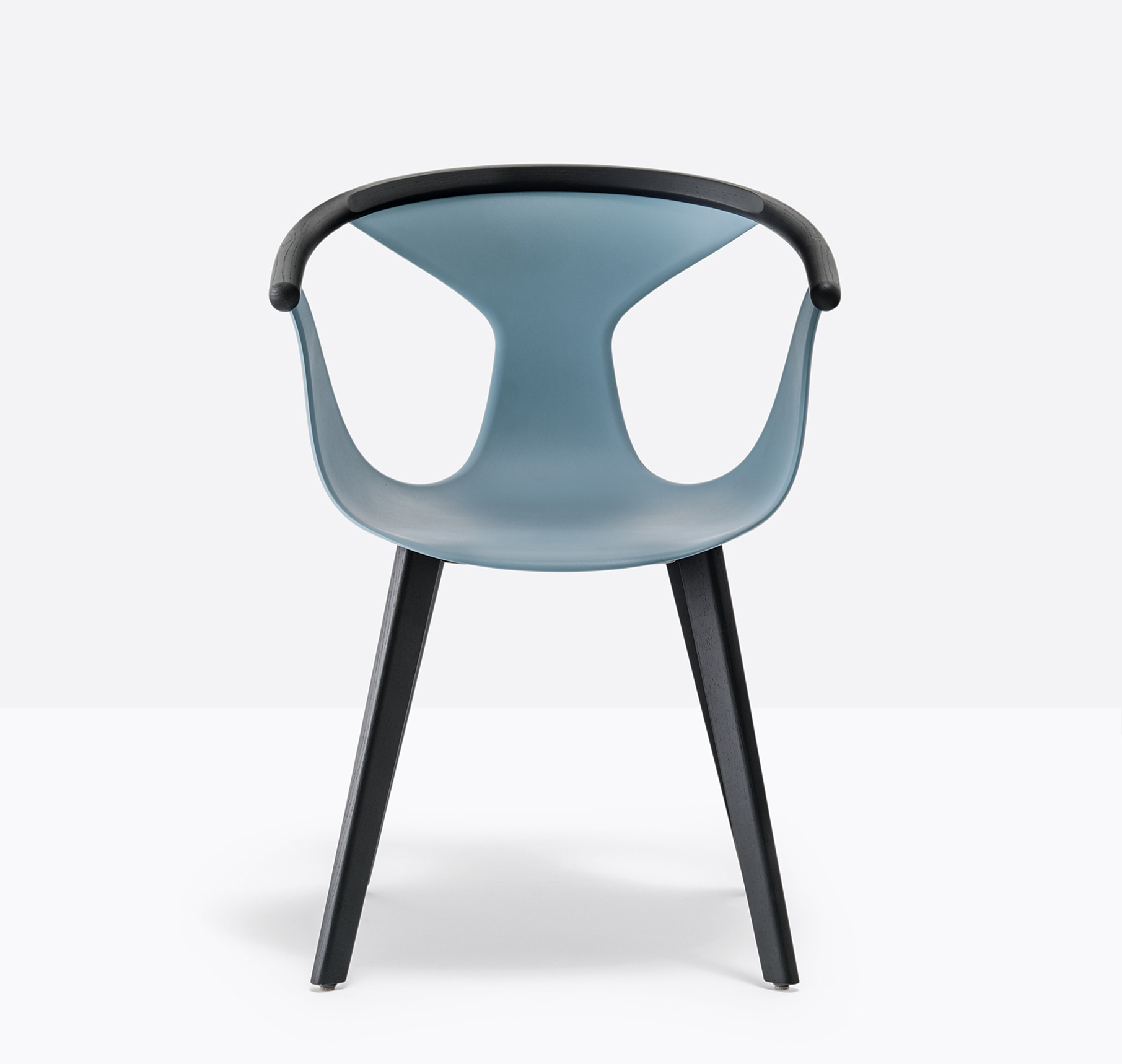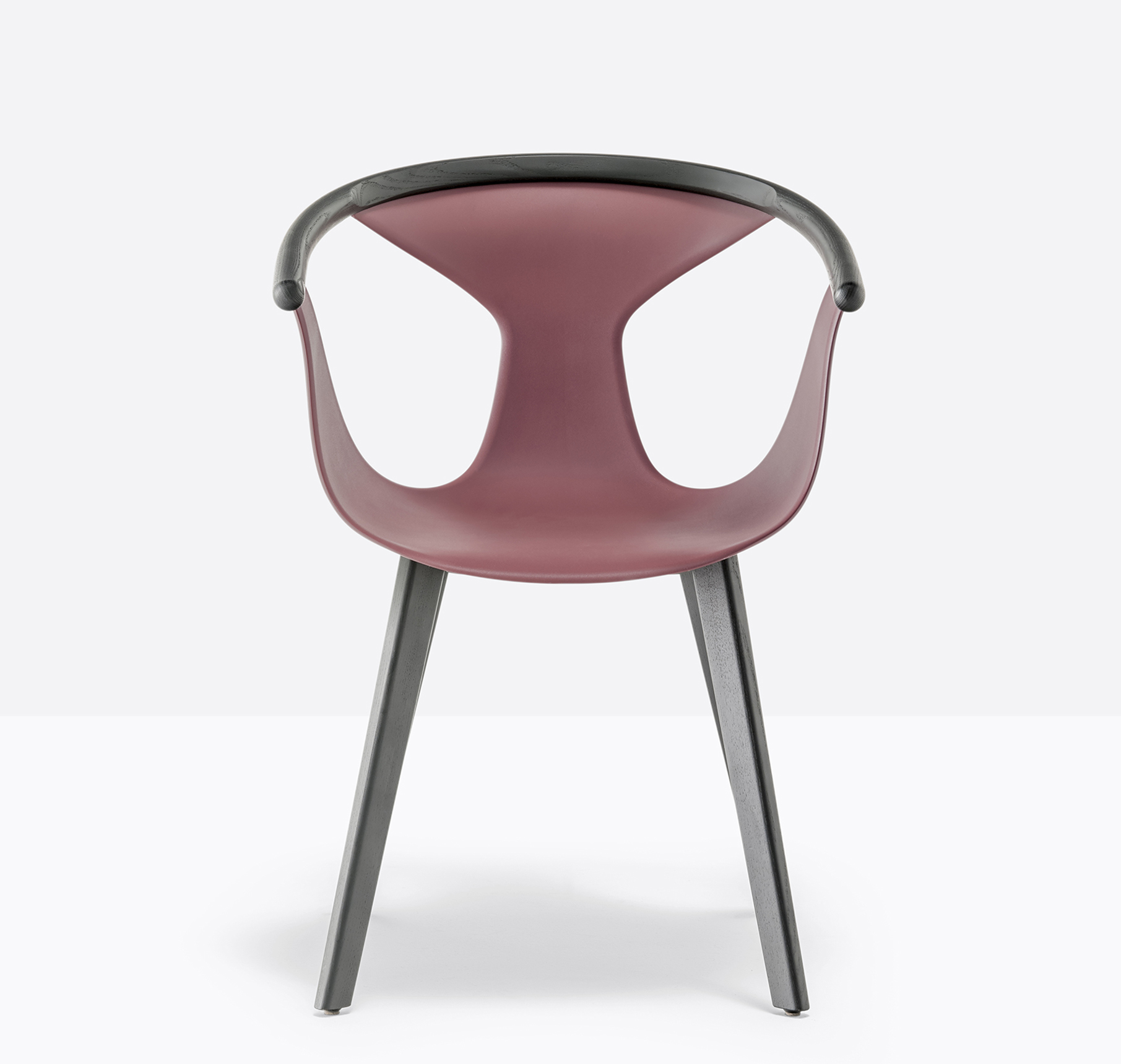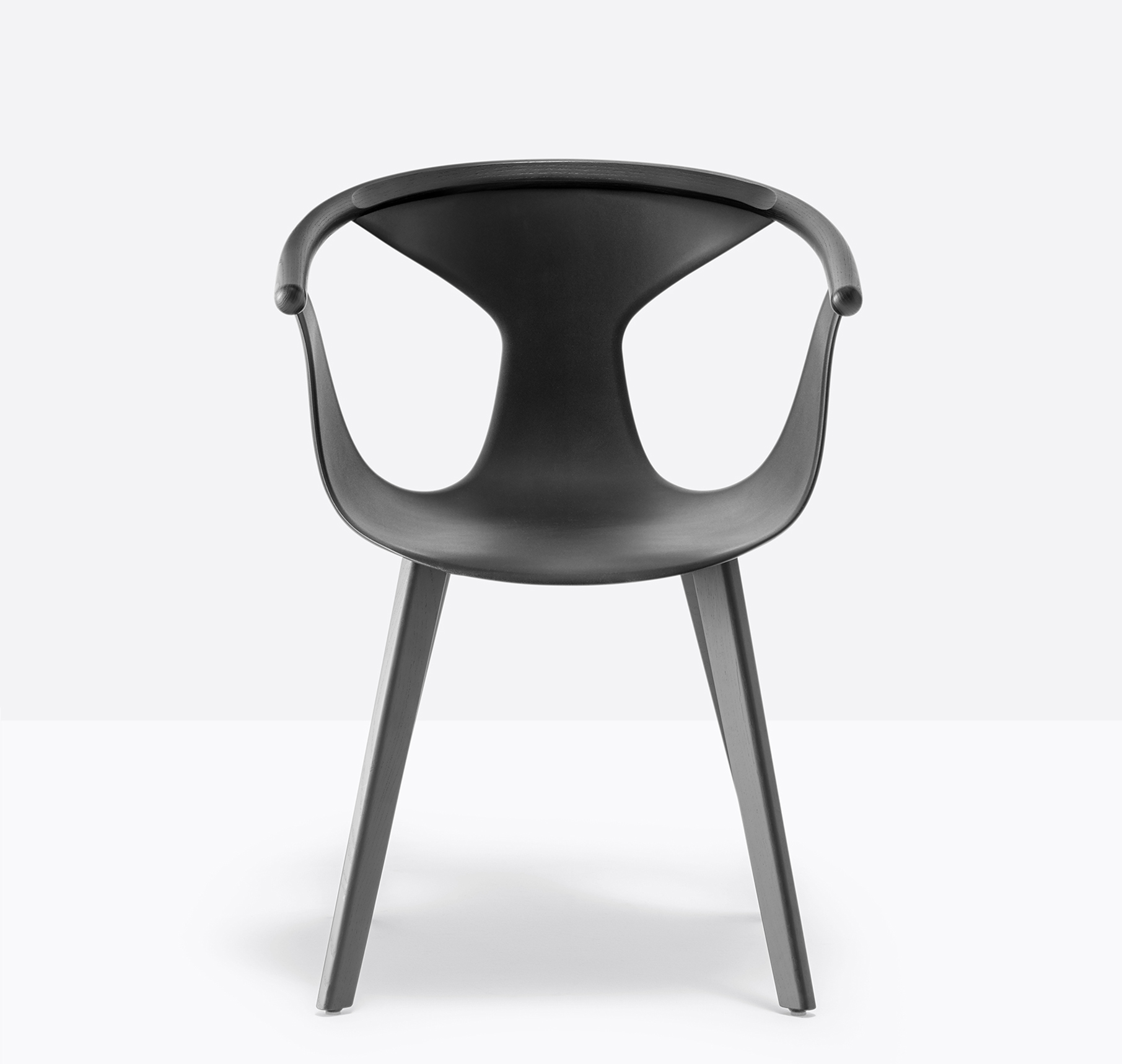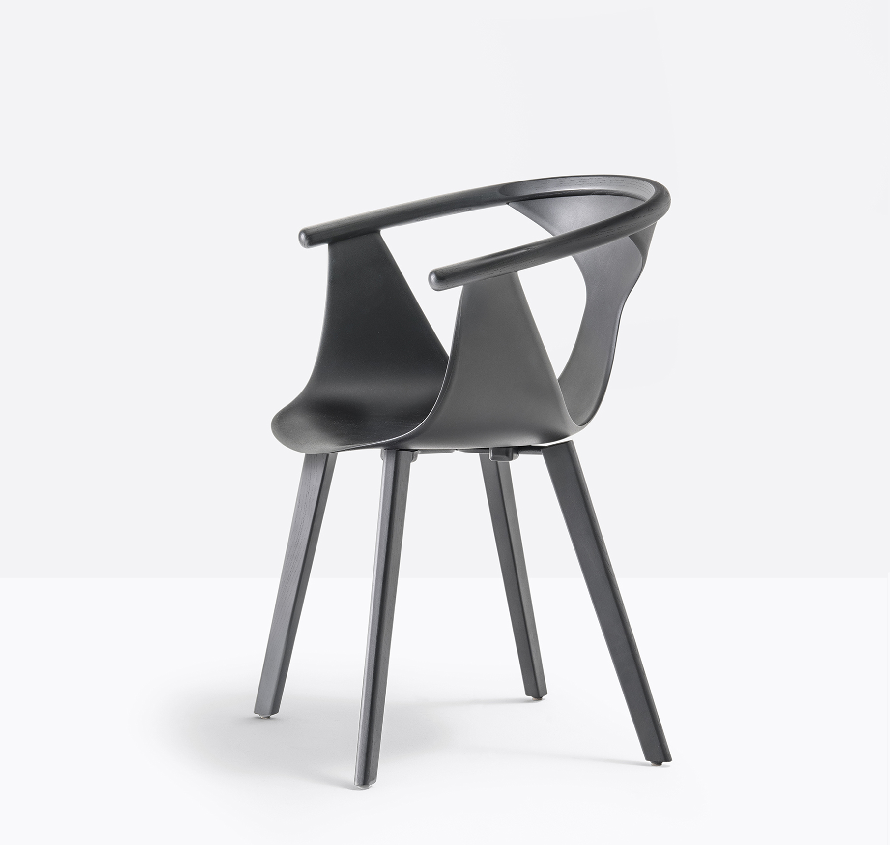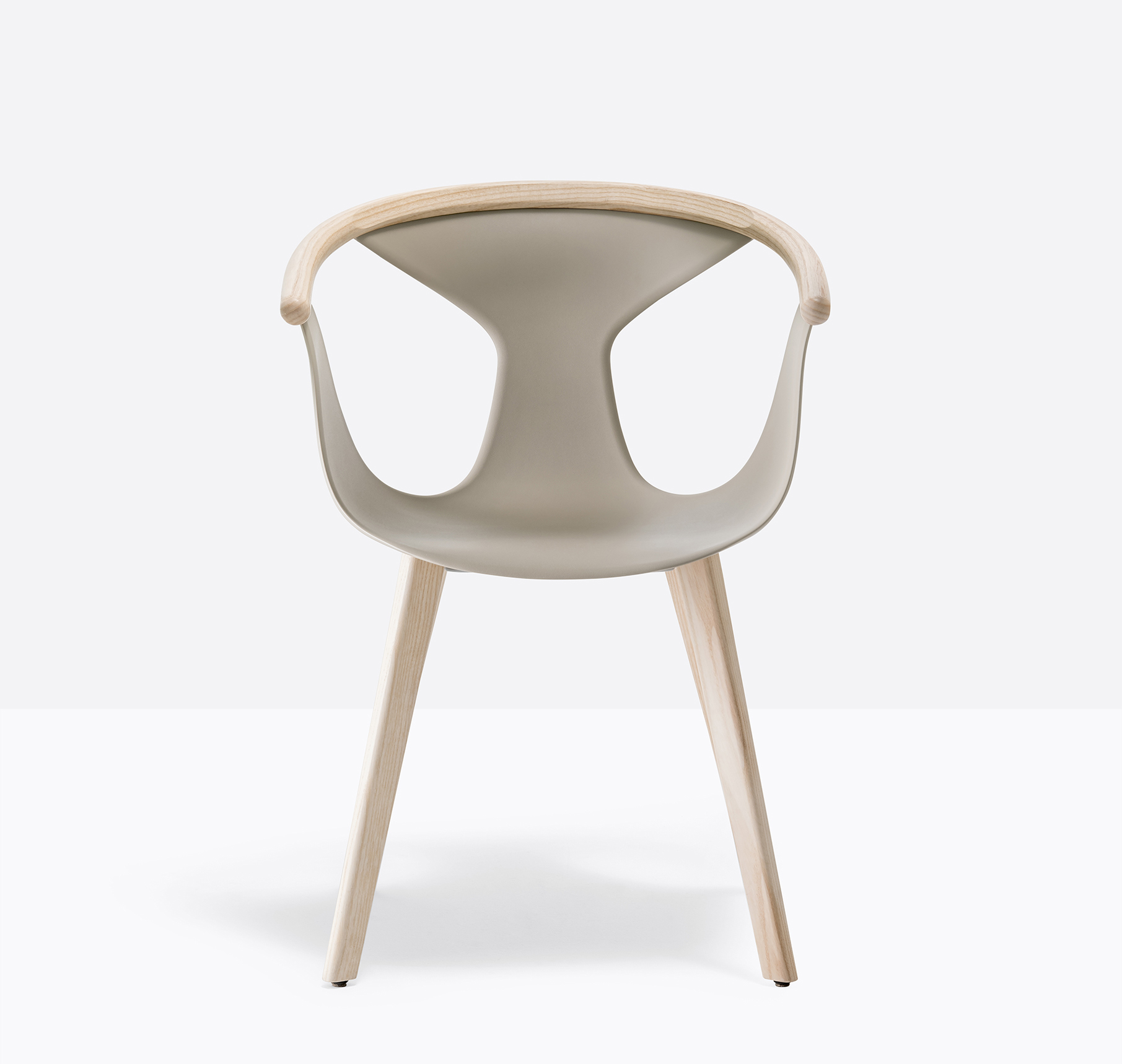 Chaise avec bras. Coque en polypropylène renforcée de fibre de verre. Contour de dossier en frêne. Pattes en frêne.