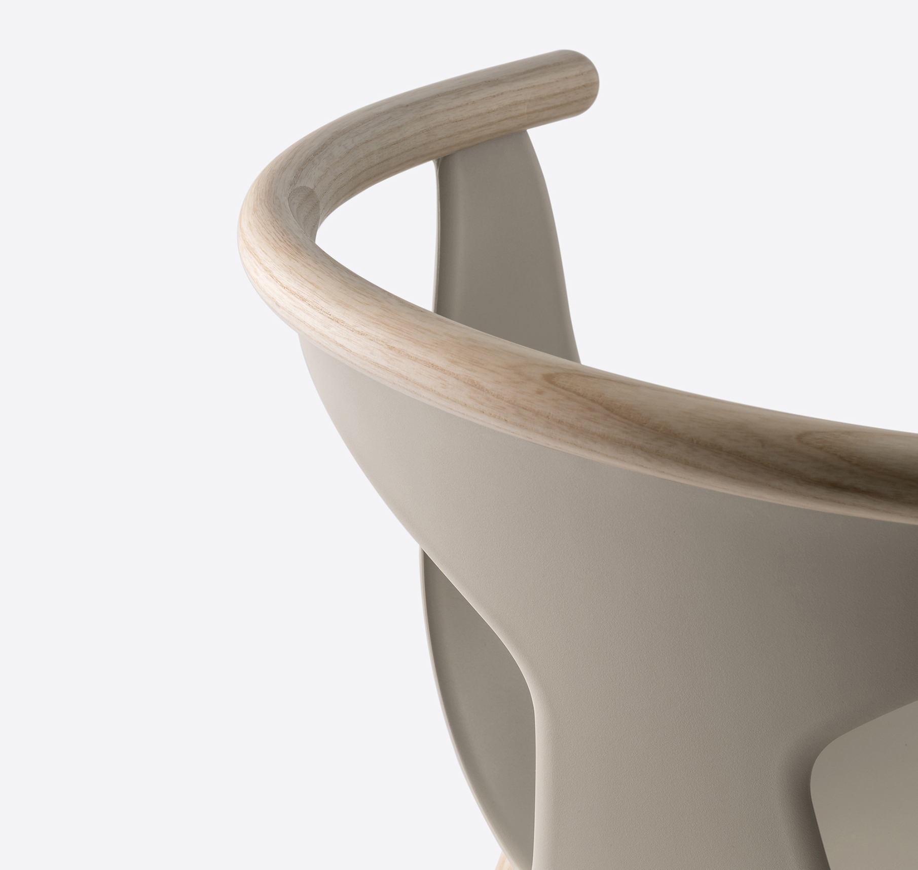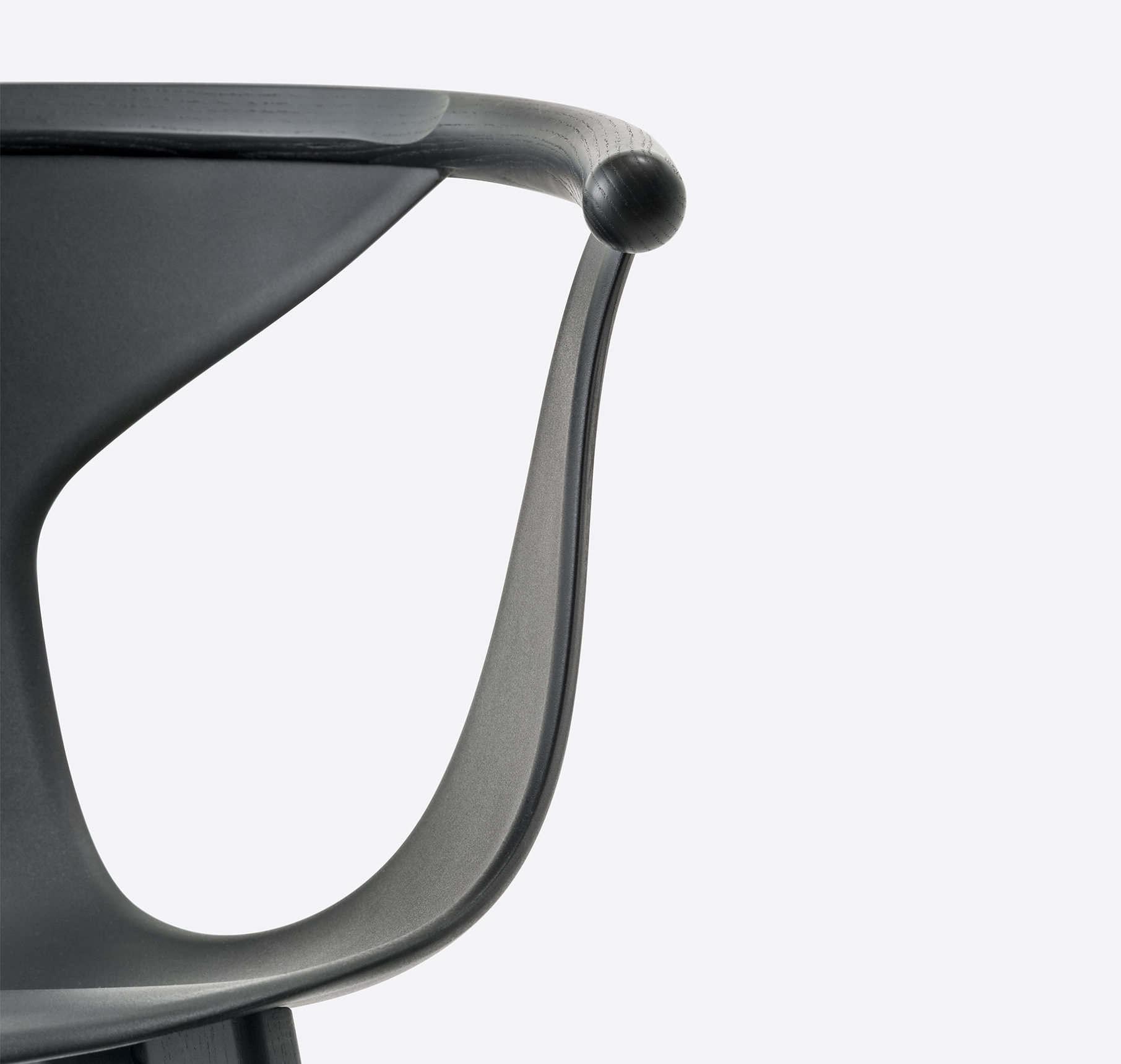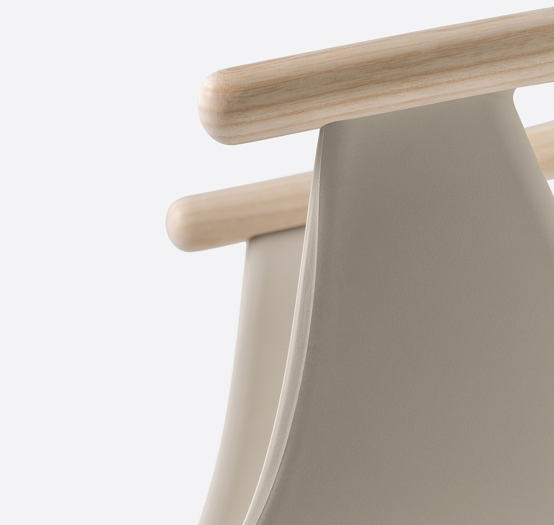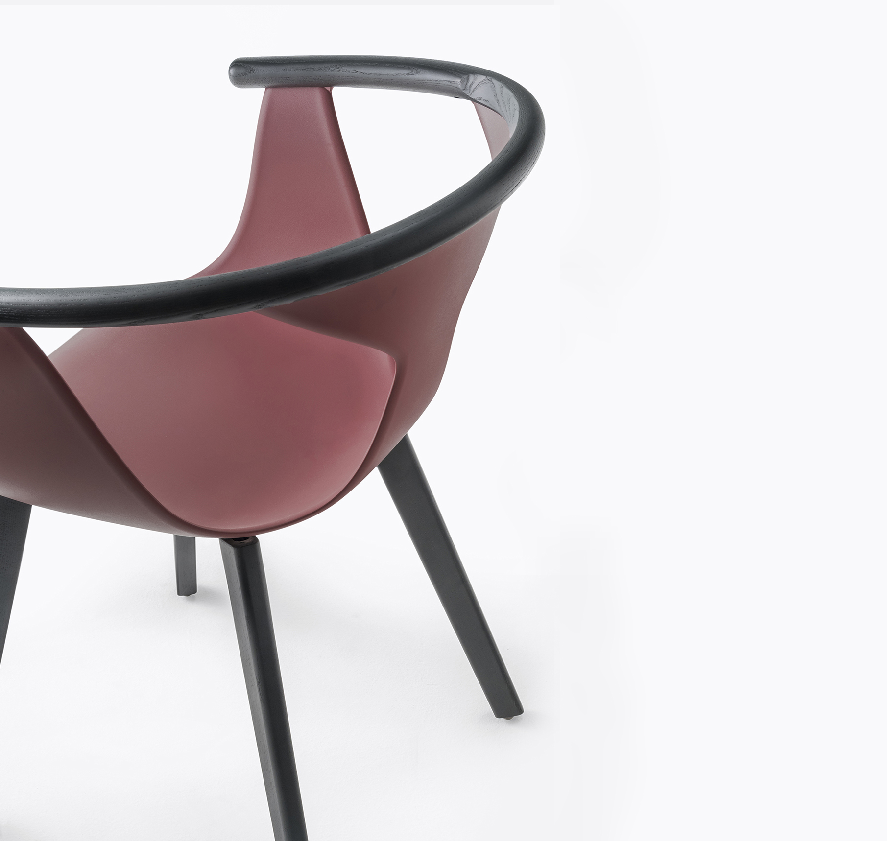 Chaise avec bras. Coque en polypropylène renforcée de fibre de verre. Contour de dossier en frêne. Pattes en frêne.