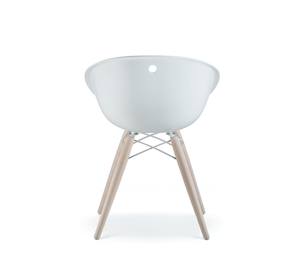 Chaise avec bras. Assise et dossier en technopolymère, structure à 4 pattes en frêne avec barres de jonction en métal.