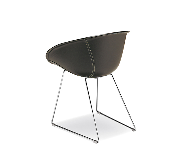 Chaise avec bras à base traineau. Assise et dossier en cuir véritable, structure tubulaire ronde en acier chromé.