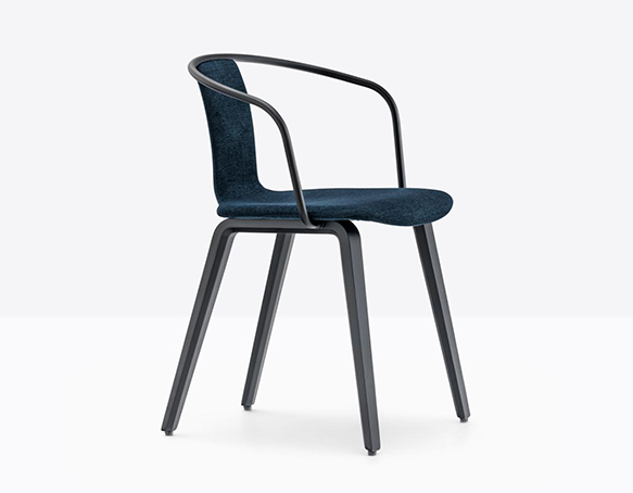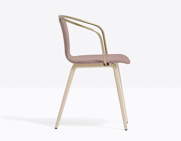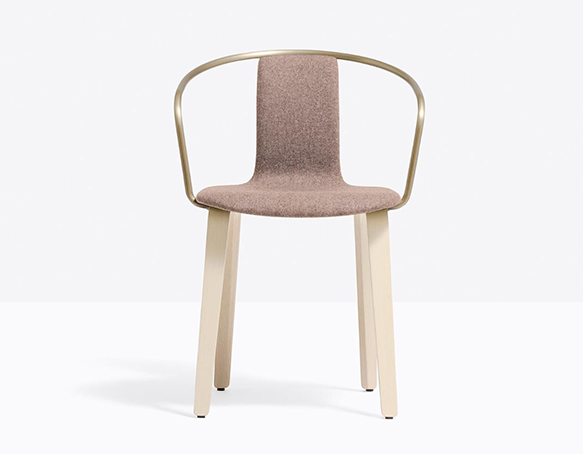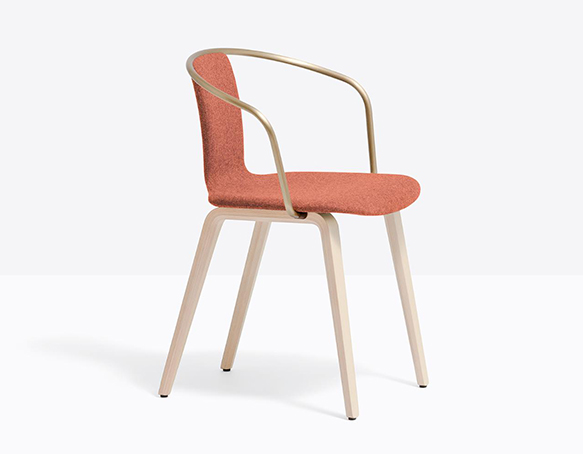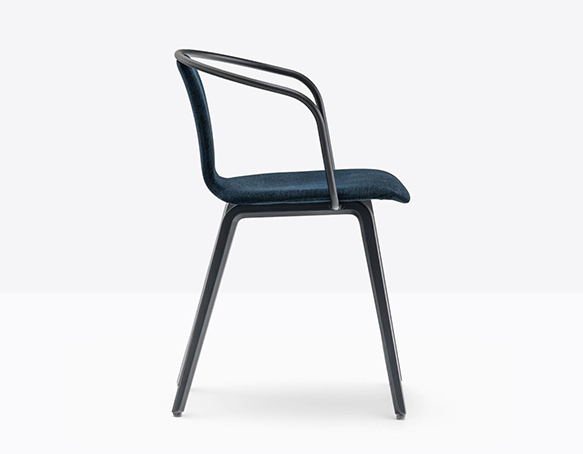 Chaise avec bras. Coque rembourrée, pattes en contreplaqué de frêne. Bordure de dossier en tige d’acier peint.