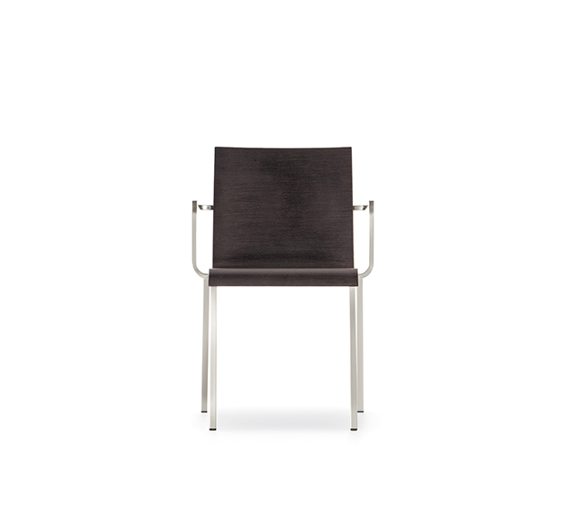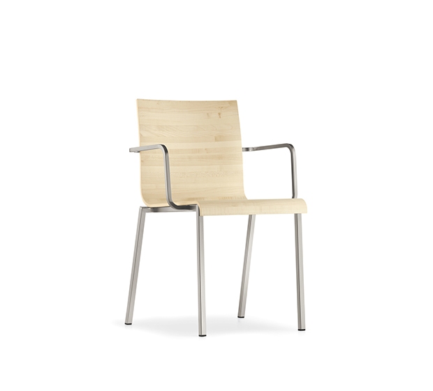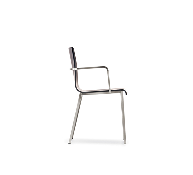 Chaise avec bras, empilable. Assise et dossier en bois, structure tubulaire carrée en acier chromé, satiné ou peint.