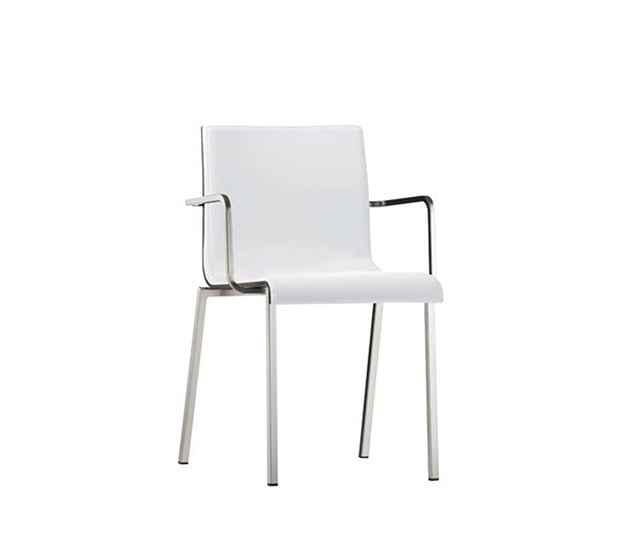 Chaise avec bras, empilable*. Assise et dossier en bois avec l’intérieur de l’assise et du dossier rembourrés, structure tubulaire carrée en acier chromé, satiné ou peint.