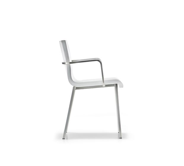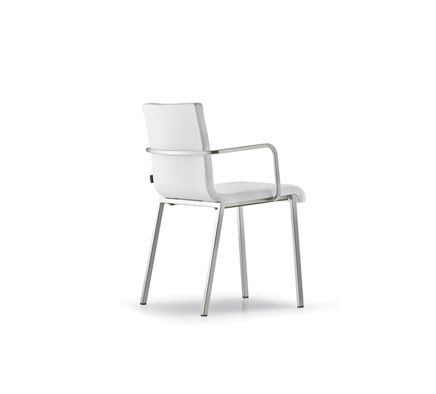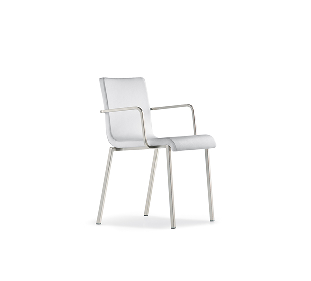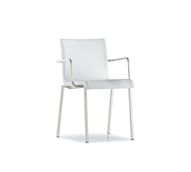 Chaise avec bras, empilable*. Assise et dossier rembourrés, structure tubulaire carrée en acier chromé, satiné ou peint.