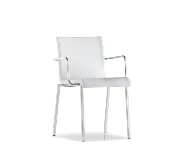 Chaise avec bras, empilable*. Assise et dossier rembourrés avec une poignée en métal à l’arrière du dossier, structure tubulaire carrée en acier chromé, satiné ou peint.