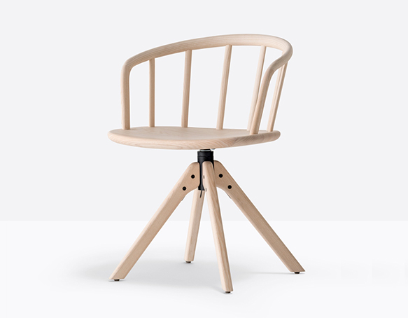 Chaise avec bras. Assise, dossier et structure en bois de frêne. Dossier vouté en bois courbé. Base centrale pivotante avec mécanisme de retour.