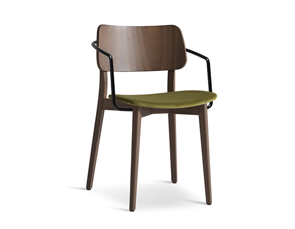 Chaise à bras. Empilable. Structure en bois, assise rembourrée, bras en métal.