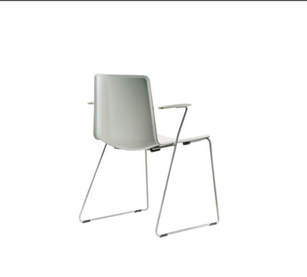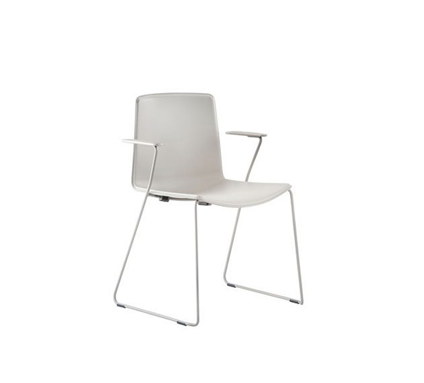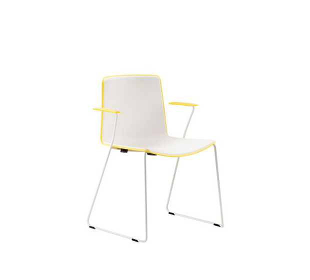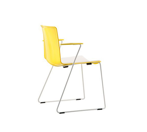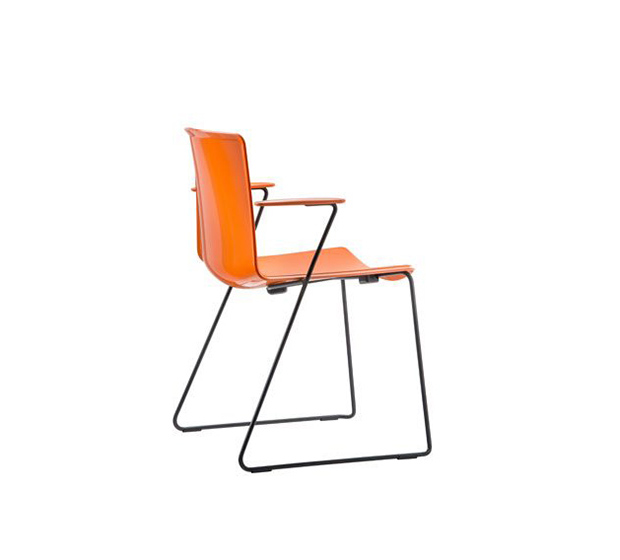 Chaise avec bras, empilable. Assise et dossier en polypropylène, fini brillant à l’extérieur et fini anti-rayure mat à l’intérieur, structure tubulaire ronde en acier chromé, chromé noir ou peint. Structure peinte non disponible dans les finis AR et GI.