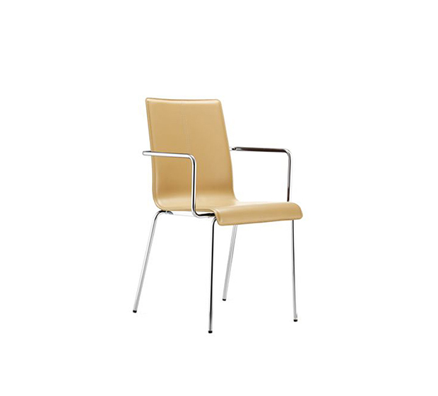 Chaise avec bras, empilable*. Assise et dossier rembourrés en cuir ou en cuir régénéré avec coutures visibles, structure tubulaire carrée en acier chromé, mat ou peint.