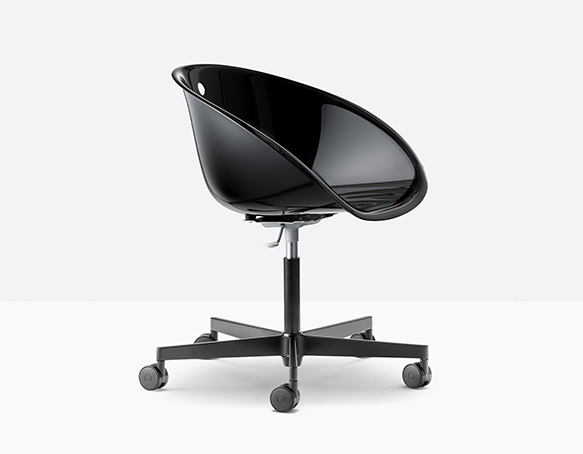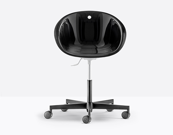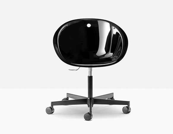 Chaise pivotante, ajustable en hauteur. Coquille en polycarbonate, base en fonte d’aluminium à 5 rayons sur roulettes.