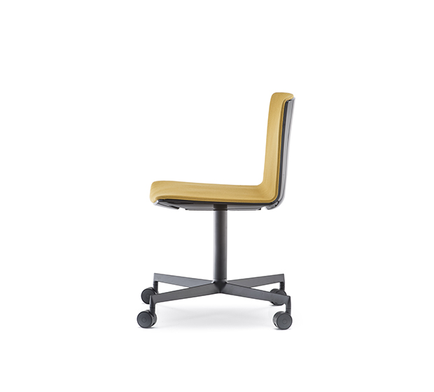 Chaise à roulettes. Assise et dossier rembourrés à l’intérieur, extérieur en polycarbonate, structure à 4 rayons en aluminium poli ou peint.