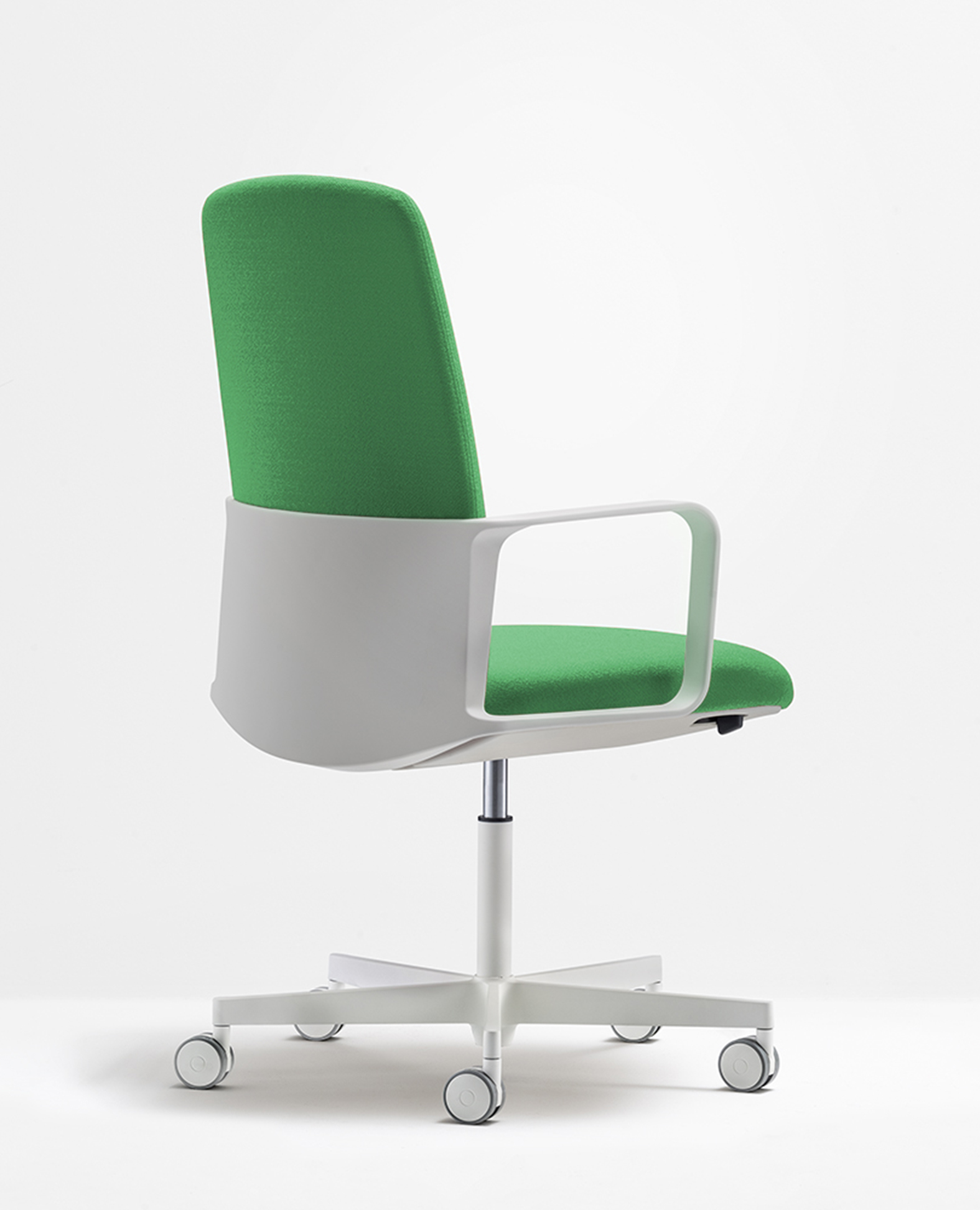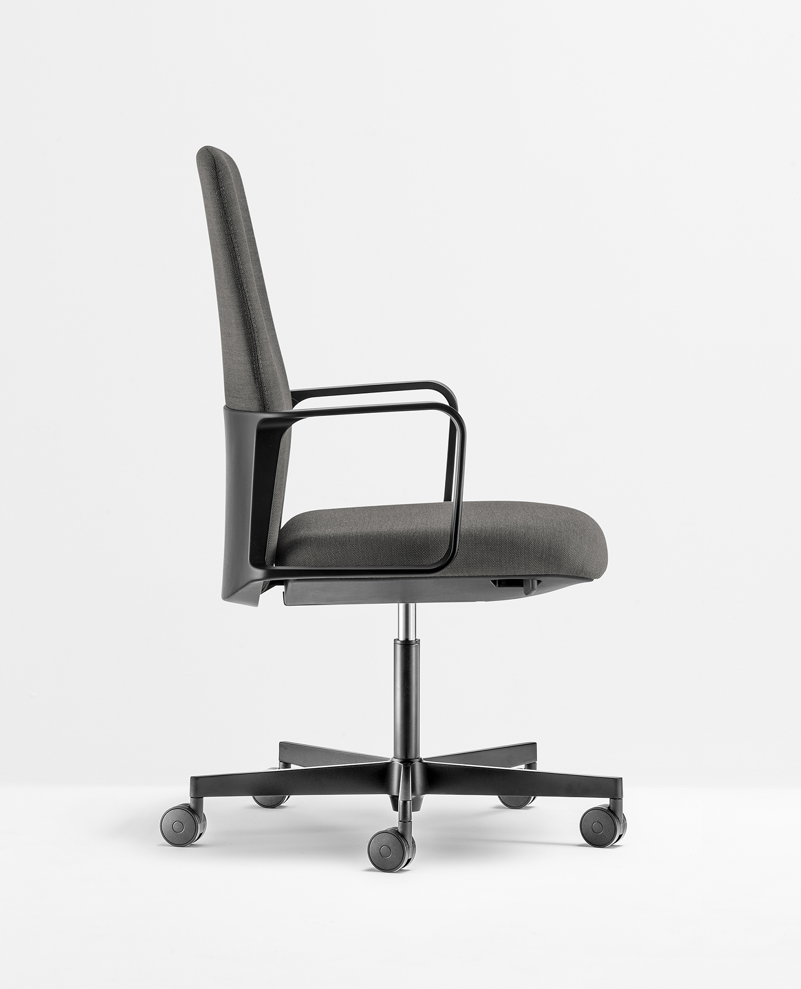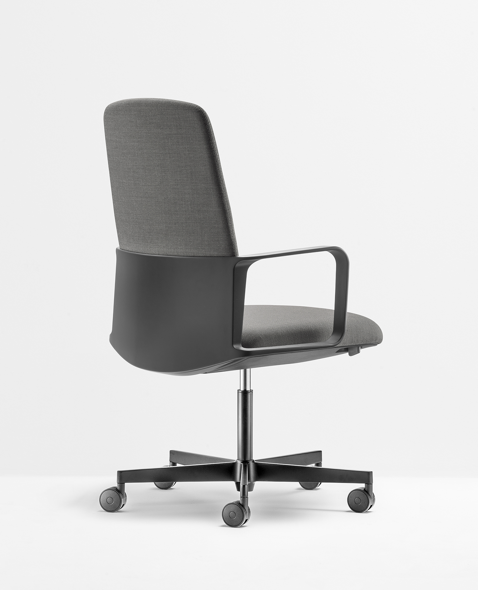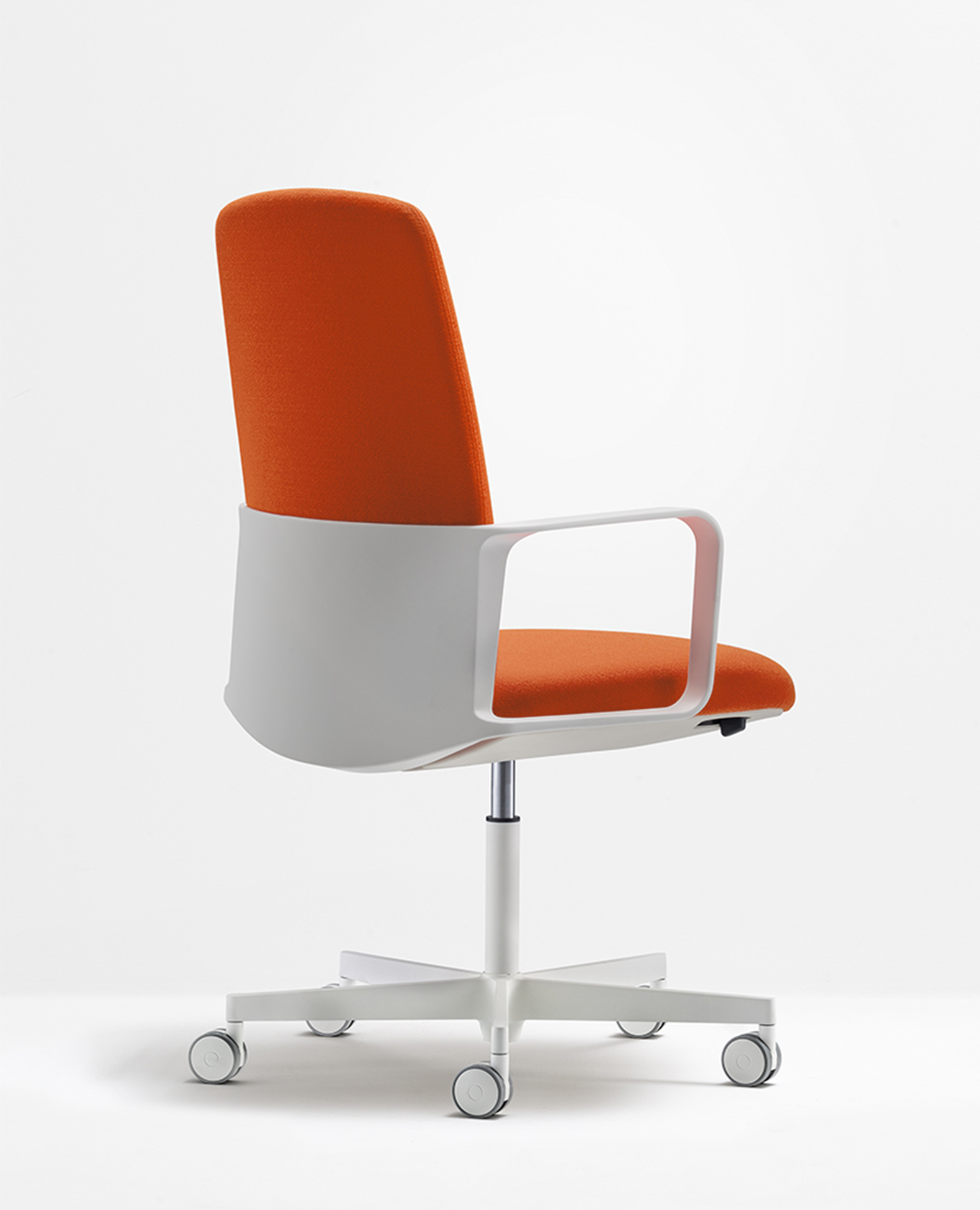 Fauteuil à roulettes. Coque et bras en polypropylène, assise et dossier rembourrés. Base à 5 rayons en aluminium poli ou peint. Mécanisme intégré d’inclinaison activé par le poids. Hauteur ajustable.
