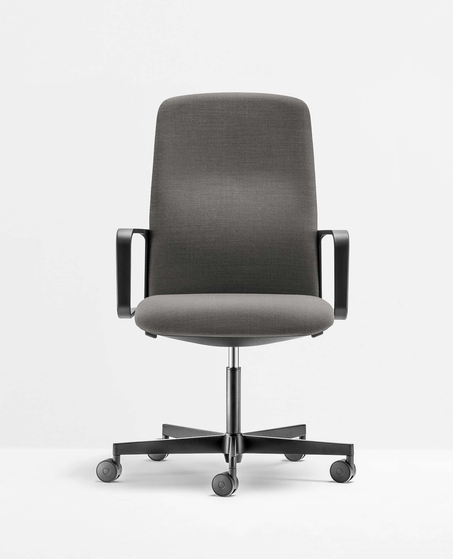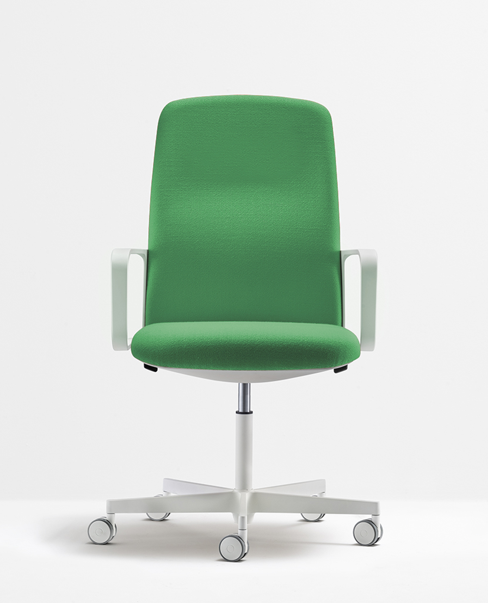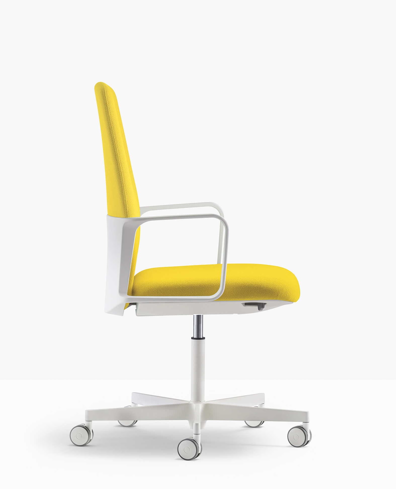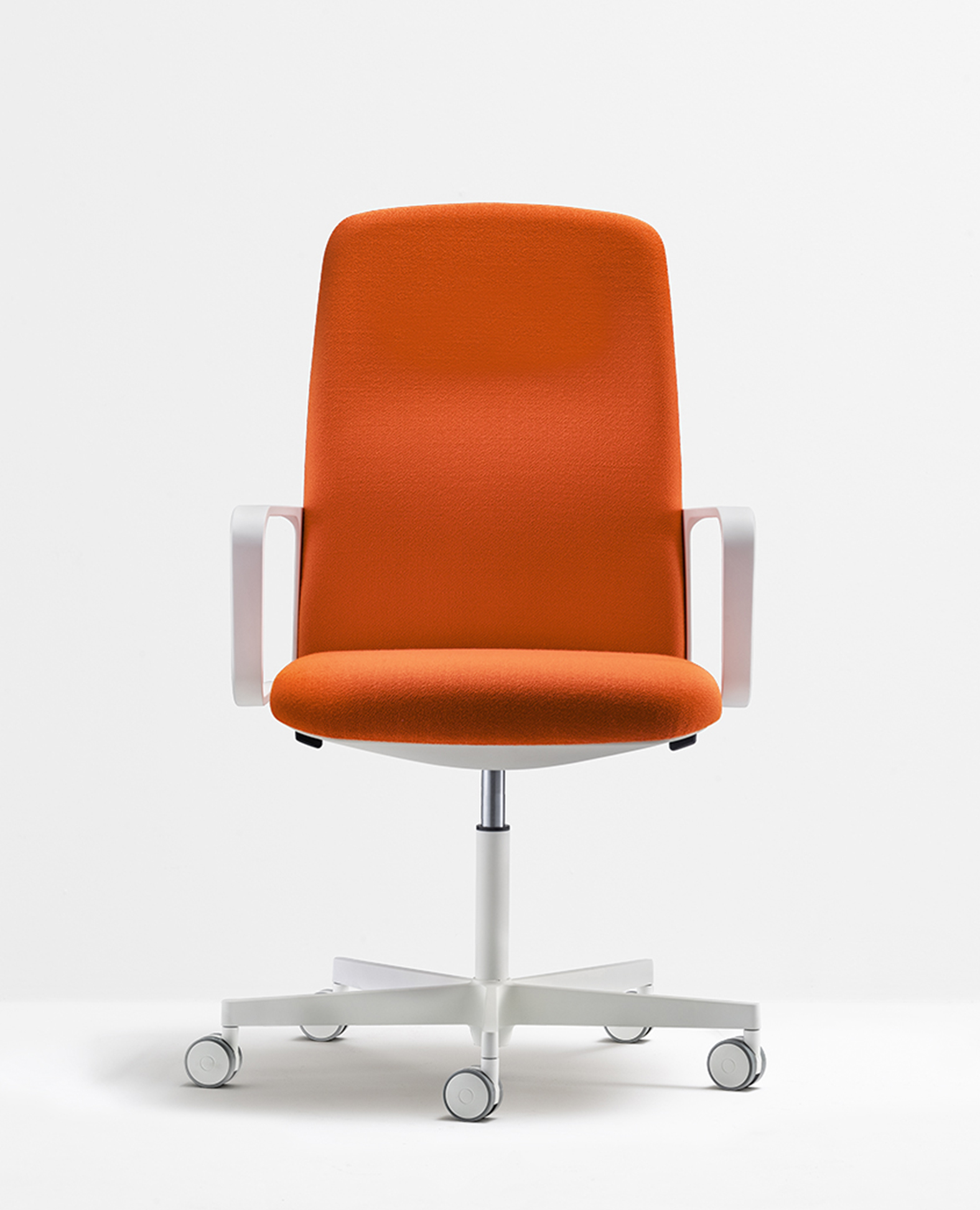 Fauteuil à roulettes. Coque et bras en polypropylène, assise et dossier rembourrés. Base à 5 rayons en aluminium poli ou peint. Mécanisme intégré d’inclinaison activé par le poids. Hauteur ajustable.