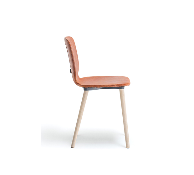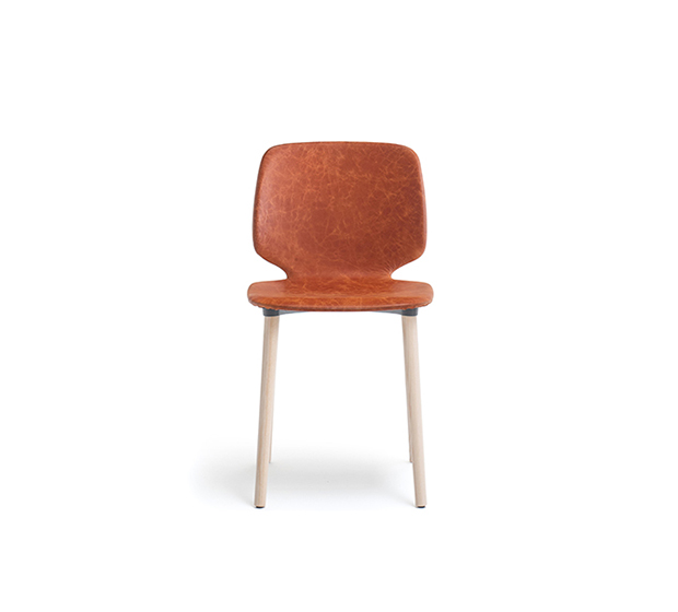 Chaise sans bras. Assise et dossier rembourrés, structure à 4 pattes en frêne.