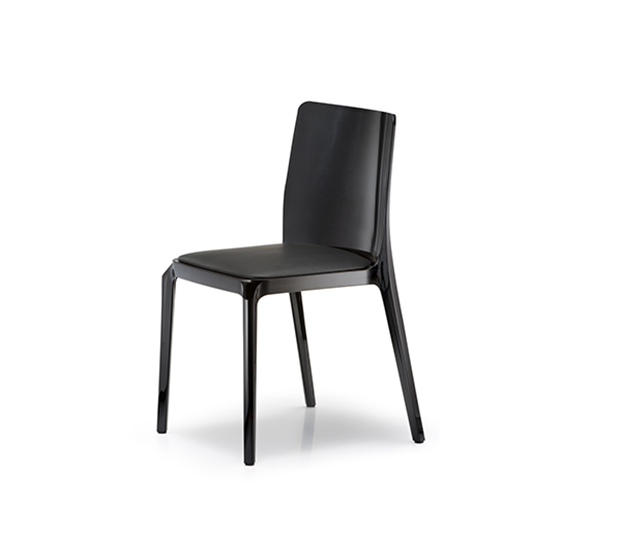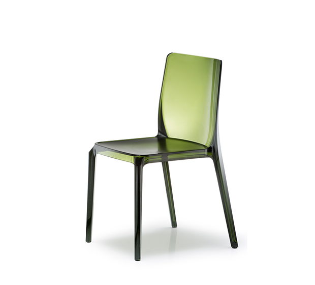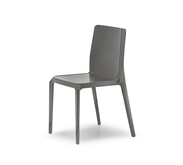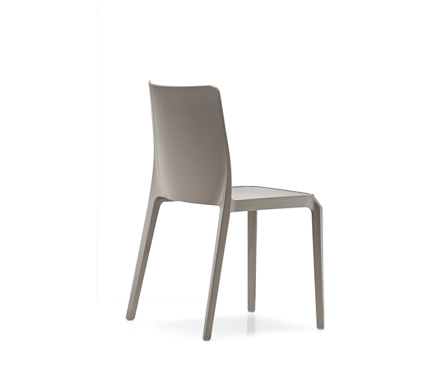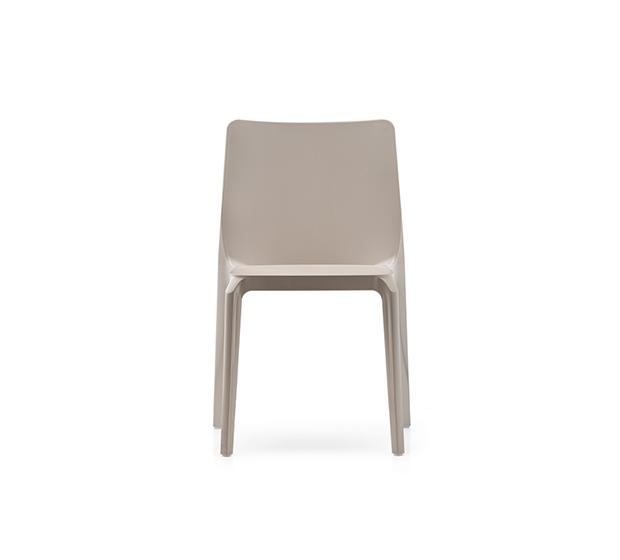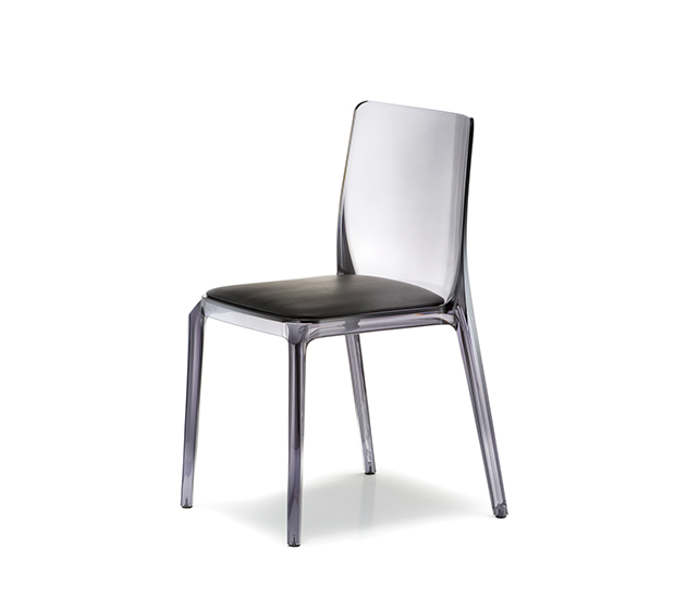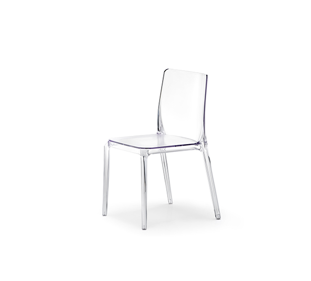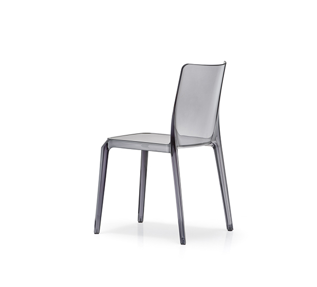 Chaise sans bras, empilable. Entièrement faite en polycarbonate. Assise recouverte d’un fini anti-rayures.