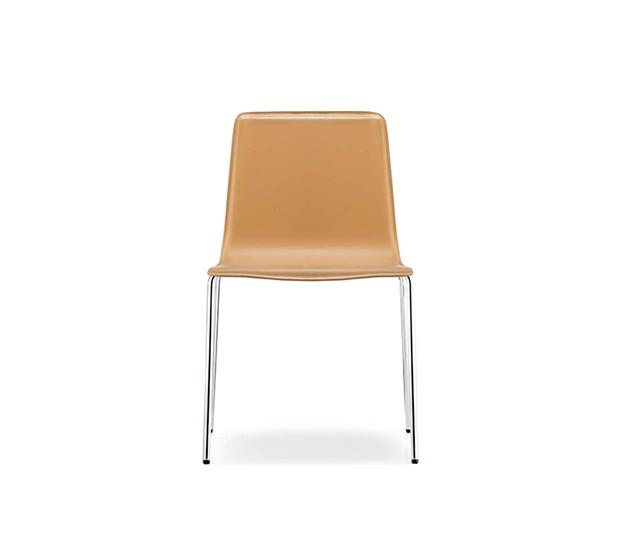 Chaise sans bras. Assise et dossier en cuir véritable ou régénéré, structure tubulaire ronde en acier chromé ou peint.