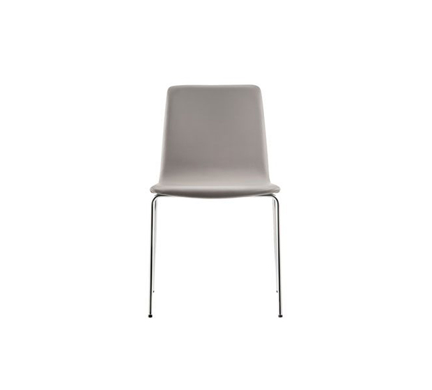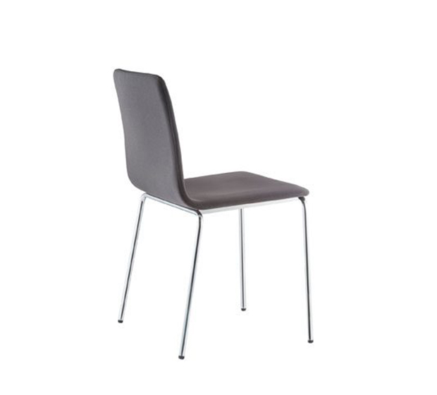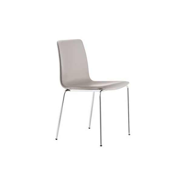 Chaise sans bras. Assise et dossier rembourrés, structure tubulaire ronde en acier chromé ou peint.