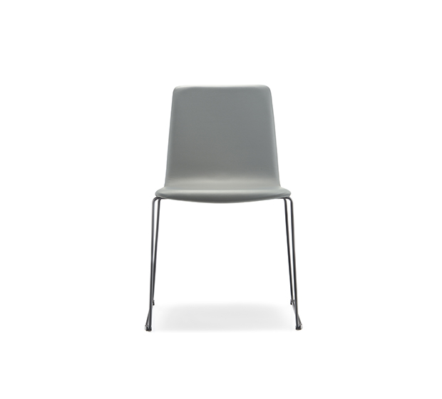 Chaise sans bras à base traineau. Assise et dossier rembourrés, structure tubulaire ronde en acier chromé ou peint.