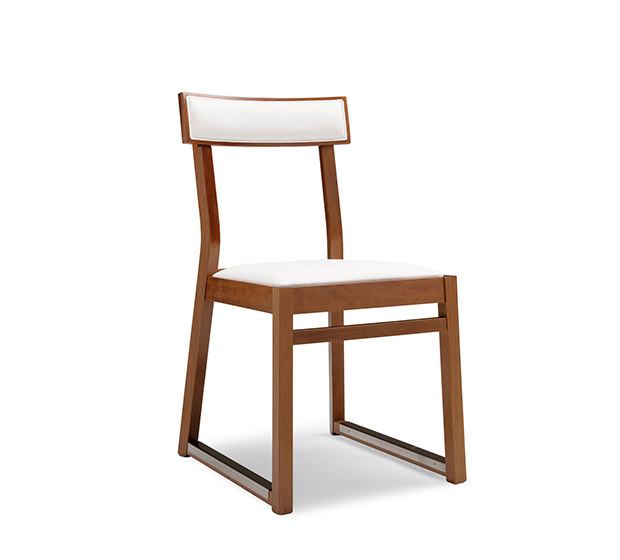 Chaise sans bras à base traineau. Assise et dossier rembourrés, structure en hêtre fini aniline, laqué ou antique.