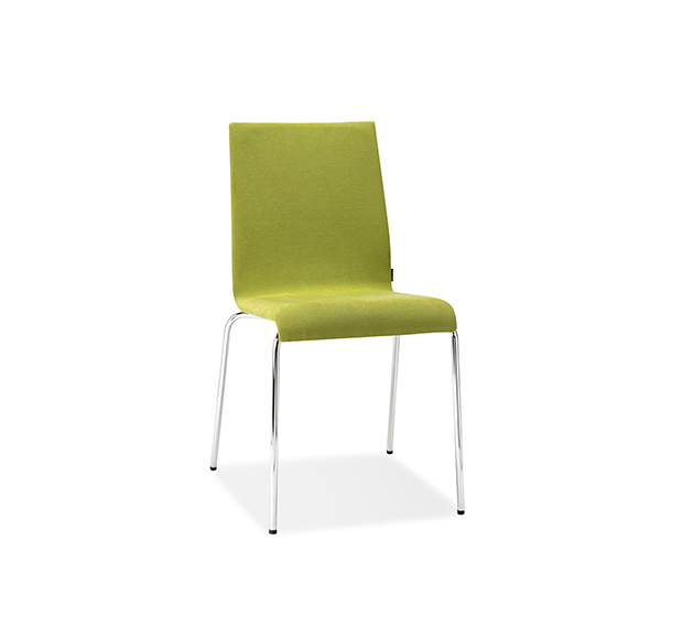 Chaise sans bras, empilable*. Assise et dossier rembourrés, structure tubulaire ronde en acier chromé, mat ou peint argent.