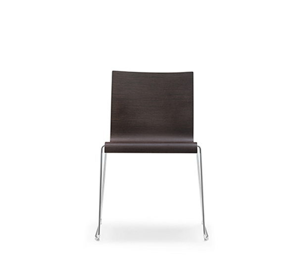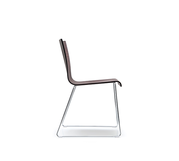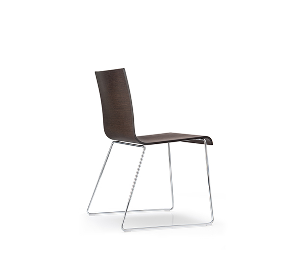 Chaise sans bras à base traîneau, empilable. Assise et dossier en bois, structure tubulaire ronde en acier chromé ou satiné.