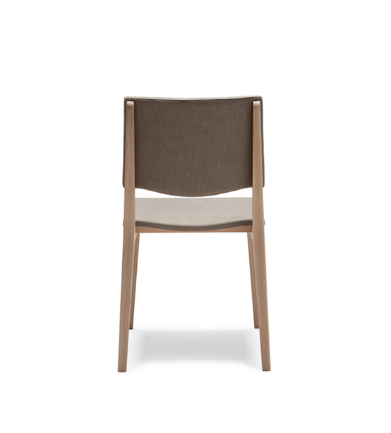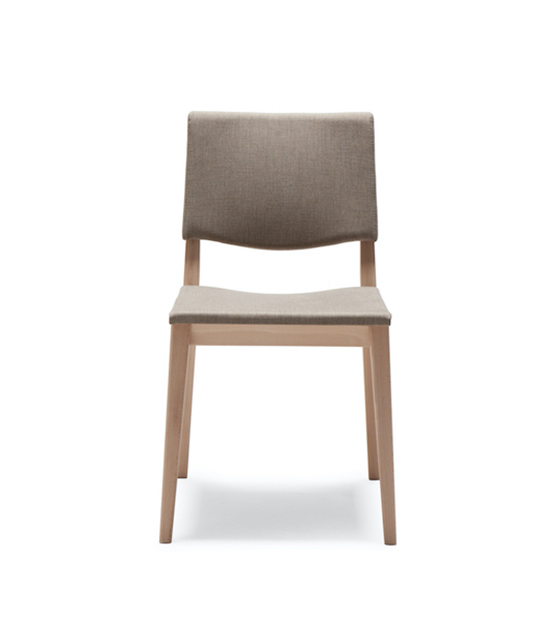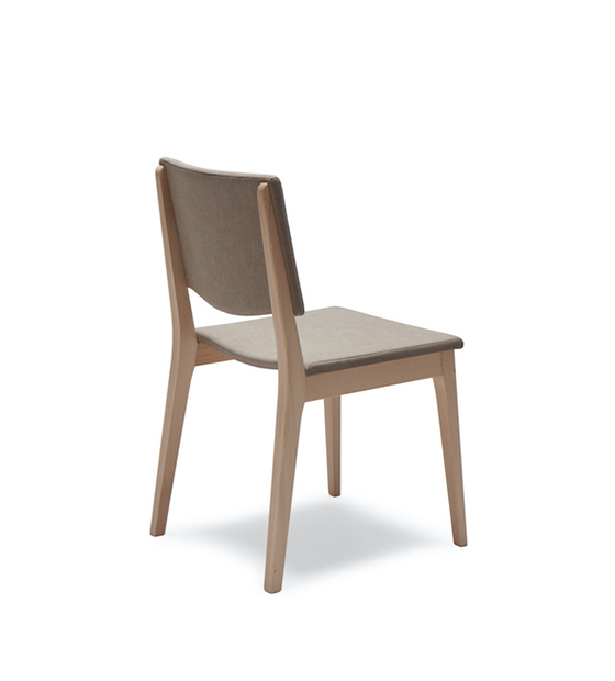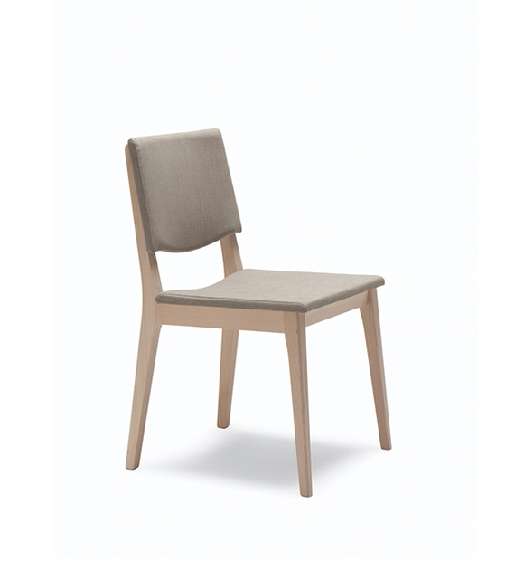 Chaise sans bras. Assise et dossier rembourrés, avec quatre pattes en bois d’hêtre.