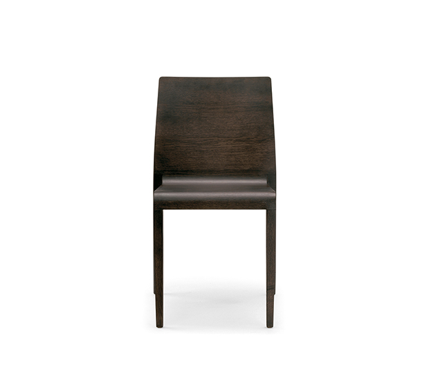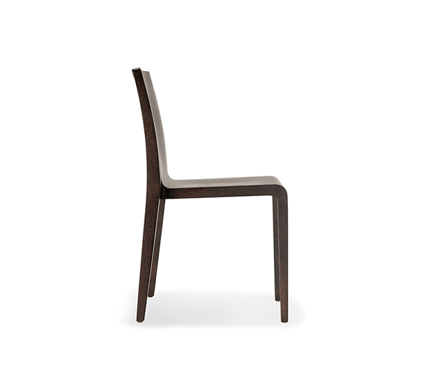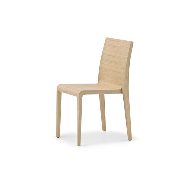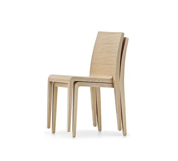 Chaise sans bras, empilable. Assise et dossier en bois, structure en chêne massif.