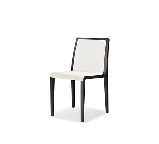 Chaise sans bras. Assise et dossier rembourrés, structure en chêne massif.