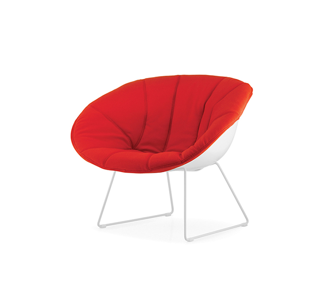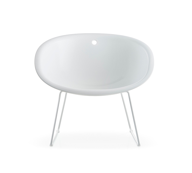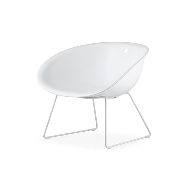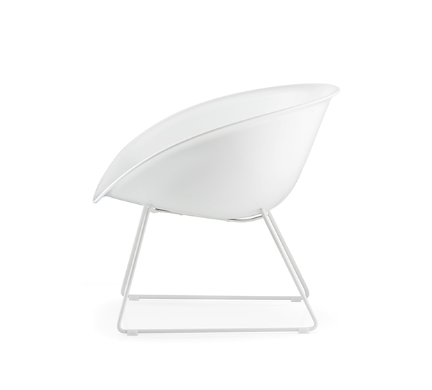Fauteuil lounge avec bras à base traîneau. Assise et dossier en technopolymère, structure tubulaire ronde en acier chromé ou peint.