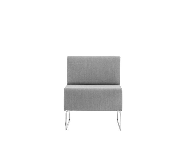 Fauteuil modulaire à base traîneau. Élément simple, assise et dossier rembourrés, structure tubulaire ronde en acier chromé ou peint. Paire d’unités de liaison incluse.