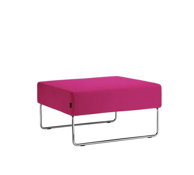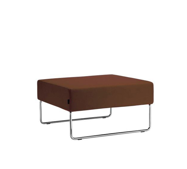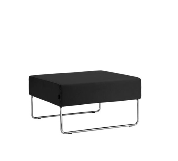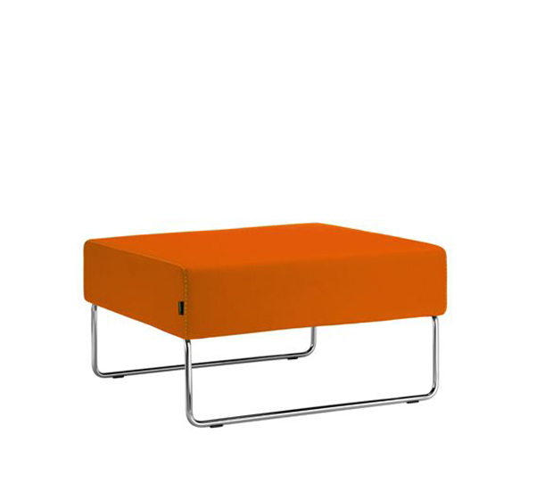 Fauteuil modulaire à base traîneau. Élément pouf, assise rembourrée, structure tubulaire ronde en acier chromé. Paire d’unités de liaison incluse.